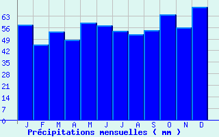| Jan | Fev | Mars | Avr | Mai | Juin | Juil | Aout | Sept | Oct | Nov | Dec | Année | | Temp. max. (°C) | 6.3 | 7.3 | 11.1 | 14.3 | 18.2 | 21.2 | 23.9 | 23.9 | 20.2 | 15.5 | 10.1 | 6.6 | 14.9 | | Temp. moy. (°C) | 3.6 | 4.1 | 7.1 | 9.4 | 13.1 | 16 | 18.4 | 18.3 | 15.2 | 11.5 | 7 | 4 | 10.7 | | Temp. min. (°C) | 1 | 0.9 | 3 | 4.5 | 8 | 10.8 | 12.9 | 12.8 | 10.2 | 7.6 | 3.9 | 1.5 | 6.5 | | Jan | Fev | Mars | Avr | Mai | Juin | Juil | Aout | Sept | Oct | Nov | Dec | Année | | Jours Tx > 30°C | 0 | 0 | 0 | 0 | 0.1 | 0.8 | 3 | 2.8 | 0.3 | 0 | 0 | 0 | 7 | | Jours Tx > 25°C | 0 | 0 | 0 | 0.1 | 2.3 | 5.5 | 12.6 | 11 | 3.5 | 0.2 | 0 | 0 | 35.2 | | Jours Tx < 0°C | 2.8 | 1.5 | 0 | 0 | 0 | 0 | 0 | 0 | 0 | 0 | 0.3 | 1.8 | 6.4 | | Jours Tn < 0°C | 12.4 | 12 | 7.7 | 3.5 | 0.2 | 0 | 0 | 0 | 0 | 1.4 | 5.9 | 12.1 | 55.1 | | Jours Tn < -5°C | 3.2 | 2.7 | 0.2 | 0 | 0 | 0 | 0 | 0 | 0 | 0 | 0.7 | 2.2 | 9 | | Jours Tn < -10°C | 0.9 | 0.2 | 0 | 0 | 0 | 0 | 0 | 0 | 0 | 0 | 0 | 0.1 | 1.3 | | | | Jan | Fev | Mars | Avr | Mai | Juin | Juil | Aout | Sept | Oct | Nov | Dec | Année | | RR mensuel (mm) | 57.5 | 45.5 | 53.4 | 48.6 | 58.9 | 57.1 | 54 | 51.7 | 54.2 | 63.8 | 56.1 | 68.6 | 669.4 | | Jan | Fev | Mars | Avr | Mai | Juin | Juil | Aout | Sept | Oct | Nov | Dec | Année | | Jours RR > 1mm | 11.2 | 9.2 | 10.6 | 9.7 | 10.2 | 8.5 | 8.3 | 7.5 | 8.6 | 10.3 | 10.9 | 11.8 | 116.9 | | Jours RR > 5mm | 4.4 | 3.6 | 3.9 | 3.7 | 4.1 | 4 | 3.7 | 3.2 | 3.4 | 4.2 | 3.9 | 4.8 | 46.9 | | Jours RR > 10mm | 1.3 | 0.8 | 0.9 | 1 | 1.5 | 1.8 | 1.8 | 1.4 | 1.6 | 1.9 | 1.3 | 1.9 | 17 | | | | Jan | Fev | Mars | Avr | Mai | Juin | Juil | Aout | Sept | Oct | Nov | Dec | Année | | Vent moyen (km/h) | 16.9 | 15.8 | 15.8 | 14.8 | 13.3 | 12.2 | 12.2 | 11.9 | 13 | 14 | 14 | 15.5 | 14 | | Jan | Fev | Mars | Avr | Mai | Juin | Juil | Aout | Sept | Oct | Nov | Dec | Année | | Jours rafales >= 58km/h | 8.2 | 6.1 | 6.6 | 4.4 | 3.2 | 2.1 | 2.2 | 2.2 | 2.7 | 4.6 | 4.7 | 5.7 | 52.8 | | Jours rafales >= 100km/h | 0.4 | 0.3 | 0.1 | 0 | 0.1 | 0 | 0 | 0 | 0 | 0.3 | 0.1 | 0.2 | 1.5 | | | | Jan | Fev | Mars | Avr | Mai | Juin | Juil | Aout | Sept | Oct | Nov | Dec | Année | | Jours avec brouillard (*) | 5.4 | 4.4 | 3.1 | 2.4 | 2.7 | 1.9 | 1.8 | 3.2 | 4.5 | 6.2 | 6 | 5.9 | 47.4 | | Jours avec orage (*) | 0.1 | 0.2 | 0.4 | 1.3 | 3.3 | -- | 3.3 | 3.3 | 1.2 | 0.7 | 0.1 | 0.3 | -- | | Jours avec grêle (*) | 0.1 | 0.1 | 0.2 | 0.2 | 0.4 | 0.1 | 0 | 0 | 0 | 0.2 | 0 | 0.1 | 1.4 | | Jours avec neige (*) | 3.6 | 4.3 | 1.9 | 0.8 | 0 | 0 | 0 | 0 | 0 | 0 | 1.1 | 2.6 | 14.3 | | | | Jan | Fev | Mars | Avr | Mai | Juin | Juil | Aout | Sept | Oct | Nov | Dec | Année | | Ensoleillement (heures) | 65.2 | 76.7 | 124 | 171.5 | 198.9 | 211.8 | 217.4 | 210.1 | 162 | 112.2 | 66.9 | 52.6 | 1669.4 |