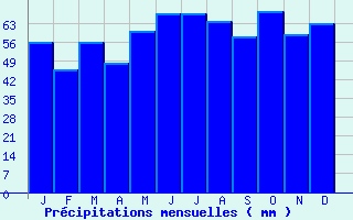 | Jan | Fev | Mars | Avr | Mai | Juin | Juil | Aout | Sept | Oct | Nov | Dec | Année | | Temp. max. (°C) | 5.8 | 6.8 | 10.7 | 14.2 | 18 | 20.8 | 23.5 | 23.4 | 19.8 | 15.1 | 9.6 | 6.2 | 14.5 | | Temp. moy. (°C) | 3.2 | 3.8 | 6.9 | 9.4 | 13.2 | 15.9 | 18.3 | 18.2 | 15.2 | 11.4 | 6.8 | 3.8 | 10.5 | | Temp. min. (°C) | 0.7 | 0.8 | 3.1 | 4.7 | 8.3 | 11 | 13.1 | 13 | 10.6 | 7.7 | 3.9 | 1.5 | 6.6 | | Jan | Fev | Mars | Avr | Mai | Juin | Juil | Aout | Sept | Oct | Nov | Dec | Année | | Jours Tx > 30°C | 0 | 0 | 0 | 0 | 0.1 | 0.5 | 2.5 | 2.2 | 0.1 | 0 | 0 | 0 | 5.3 | | Jours Tx > 25°C | 0 | 0 | 0 | 0.3 | 2.4 | 5.3 | 10.5 | 9.2 | 2.9 | 0.2 | 0 | 0 | 31 | | Jours Tx < 0°C | 2.9 | 1.7 | 0.1 | 0 | 0 | 0 | 0 | 0 | 0 | 0 | 0.5 | 2.3 | 7.6 | | Jours Tn < 0°C | 12.4 | 11.4 | 7.2 | 2.8 | 0.1 | 0 | 0 | 0 | 0 | 1.4 | 5.4 | 11.6 | 52.3 | | Jours Tn < -5°C | 3.5 | 3 | 0.4 | 0 | 0 | 0 | 0 | 0 | 0 | 0 | 0.6 | 2.3 | 9.9 | | Jours Tn < -10°C | 1.1 | 0.3 | 0 | 0 | 0 | 0 | 0 | 0 | 0 | 0 | 0 | 0.2 | 1.6 | | | | Jan | Fev | Mars | Avr | Mai | Juin | Juil | Aout | Sept | Oct | Nov | Dec | Année | | RR mensuel (mm) | 56.1 | 45.9 | 55.9 | 48.4 | 60.1 | 66.5 | 66.6 | 64 | 57.9 | 67.7 | 59 | 63 | 711.1 | | Jan | Fev | Mars | Avr | Mai | Juin | Juil | Aout | Sept | Oct | Nov | Dec | Année | | Jours RR > 1mm | 11.3 | 9.7 | 11.6 | 9.5 | 10.7 | 9.9 | 9.8 | 9.4 | 9.5 | 10.8 | 11.7 | 11.5 | 125.6 | | Jours RR > 5mm | 4 | 3 | 3.9 | 3.4 | 4.2 | 4.3 | 4.5 | 4.6 | 4.1 | 4.1 | 4.3 | 4.6 | 49 | | Jours RR > 10mm | 1.1 | 0.9 | 1 | 1.1 | 1.5 | 1.9 | 2 | 1.5 | 1.5 | 2 | 1.1 | 1.5 | 17.3 | | | | Jan | Fev | Mars | Avr | Mai | Juin | Juil | Aout | Sept | Oct | Nov | Dec | Année | | Vent moyen (km/h) | 21.2 | 19.4 | 19.1 | 17.6 | 15.8 | 14.8 | 15.1 | 14.8 | 15.8 | 18 | 18.4 | 19.8 | 17.6 | | Jan | Fev | Mars | Avr | Mai | Juin | Juil | Aout | Sept | Oct | Nov | Dec | Année | | Jours rafales >= 58km/h | 11.1 | 6.8 | 8.1 | 4.8 | 3.9 | 2.2 | 3.1 | 3.1 | 3.2 | 5.5 | 6.3 | 7.6 | 65.7 | | Jours rafales >= 100km/h | 0.7 | 0.4 | 0.4 | 0.1 | 0 | 0.1 | 0 | 0 | 0 | 0.2 | 0.3 | 0.3 | 2.4 |
