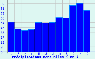 | Jan | Fev | Mars | Avr | Mai | Juin | Juil | Aout | Sept | Oct | Nov | Dec | Année | | Temp. max. (°C) | 7.4 | 8.2 | 10.4 | 13.3 | 16.4 | 19.2 | 21.7 | 22.2 | 19.3 | 15.3 | 10.9 | 7.4 | 14.3 | | Temp. moy. (°C) | 4.9 | 5.4 | 7.2 | 9.3 | 12.4 | 15.1 | 17.5 | 17.8 | 15.3 | 11.9 | 8.2 | 4.9 | 10.9 | | Temp. min. (°C) | 2.4 | 2.7 | 3.9 | 5.3 | 8.4 | 11 | 13.2 | 13.5 | 11.2 | 8.4 | 5.5 | 2.5 | 7.4 | | Jan | Fev | Mars | Avr | Mai | Juin | Juil | Aout | Sept | Oct | Nov | Dec | Année | | Jours Tx > 30°C | 0 | 0 | 0 | 0 | 0.1 | 0.4 | 0.4 | 1 | 0.1 | 0 | 0 | 0 | 1.8 | | Jours Tx > 25°C | 0 | 0 | 0 | 0 | 0.9 | 2.2 | 5 | 4.8 | 1.5 | 0.1 | 0 | 0 | 14.3 | | Jours Tx < 0°C | 1.3 | 0.2 | 0 | 0 | 0 | 0 | 0 | 0 | 0 | 0 | 0.2 | 1.4 | 3.1 | | Jours Tn < 0°C | 8.8 | 7.2 | 5 | 1.8 | 0.1 | 0 | 0 | 0 | 0 | 0.9 | 2.8 | 9.1 | 35.6 | | Jours Tn < -5°C | 2.1 | 0.8 | 0.1 | 0.1 | 0 | 0 | 0 | 0 | 0 | 0.1 | 0.3 | 1.8 | 5.1 | | Jours Tn < -10°C | 0.3 | 0 | 0 | 0 | 0 | 0 | 0 | 0 | 0 | 0 | 0 | 0.1 | 0.4 | | | | Jan | Fev | Mars | Avr | Mai | Juin | Juil | Aout | Sept | Oct | Nov | Dec | Année | | RR mensuel (mm) | 55.3 | 42.7 | 39.9 | 41.3 | 54.5 | 53.6 | 54.8 | 63.5 | 63 | 86.2 | 90.7 | 77.1 | 722.6 | | Jan | Fev | Mars | Avr | Mai | Juin | Juil | Aout | Sept | Oct | Nov | Dec | Année | | Jours RR > 1mm | 11 | 9.3 | 8.8 | 8.6 | 9.1 | 8.8 | 8.4 | 8.4 | 10.1 | 11.7 | 13.3 | 12 | 119 | | Jours RR > 5mm | 4.2 | 2.7 | 2.7 | 3.1 | 3.9 | 3.8 | 3.6 | 4.1 | 4.4 | 6.2 | 6 | 5.2 | 49.8 | | Jours RR > 10mm | 1.5 | 0.8 | 0.6 | 0.8 | 1.7 | 1.6 | 1.7 | 2 | 1.6 | 3 | 2.8 | 2.4 | 20.2 | | | | Jan | Fev | Mars | Avr | Mai | Juin | Juil | Aout | Sept | Oct | Nov | Dec | Année | | Vent moyen (km/h) | 20.9 | 20.2 | 19.8 | 18 | 17.3 | 15.5 | 15.8 | 15.8 | 16.2 | 17.3 | 18.7 | 18.7 | 18 | | Jan | Fev | Mars | Avr | Mai | Juin | Juil | Aout | Sept | Oct | Nov | Dec | Année | | Jours rafales >= 58km/h | 13.6 | 10.7 | 10.5 | 7.1 | 7.2 | 4.4 | 4.7 | 4.8 | 6 | 7.8 | 9.7 | 10.2 | 96.6 | | Jours rafales >= 100km/h | 1.1 | 0.5 | 0.3 | 0.1 | 0 | 0.1 | 0 | 0 | 0 | 0.5 | 0.4 | 0.4 | 3.5 |