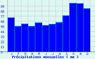 | Jan | Fev | Mars | Avr | Mai | Juin | Juil | Aout | Sept | Oct | Nov | Dec | Année | | Temp. max. (°C) | 7.2 | 7.7 | 10.5 | 13.4 | 17 | 19.2 | 21.3 | 21.6 | 19.3 | 15.6 | 11 | 7.7 | 14.3 | | Temp. moy. (°C) | 4.7 | 4.7 | 7.1 | 9.3 | 12.7 | 15.2 | 17.4 | 17.6 | 15.3 | 12.2 | 8 | 5.1 | 10.8 | | Temp. min. (°C) | 2.1 | 1.8 | 3.8 | 5.1 | 8.4 | 11.3 | 13.5 | 13.6 | 11.3 | 8.7 | 5.1 | 2.6 | 7.3 | | Jan | Fev | Mars | Avr | Mai | Juin | Juil | Aout | Sept | Oct | Nov | Dec | Année | | Jours Tx > 30°C | 0 | 0 | 0 | 0 | 0 | 0.5 | 0.8 | 0.9 | 0 | 0 | 0 | 0 | 2.2 | | Jours Tx > 25°C | 0 | 0 | 0 | 0 | 1.8 | 2.9 | 5.4 | 4.6 | 1.6 | 0.1 | 0 | 0 | 16.6 | | Jours Tx < 0°C | 1.7 | 0.6 | 0 | 0 | 0 | 0 | 0 | 0 | 0 | 0 | 0.1 | 0.9 | 3.3 | | Jours Tn < 0°C | 9.4 | 9.5 | 5.5 | 2.2 | 0.1 | 0 | 0 | 0 | 0 | 0.7 | 4 | 10.1 | 41.5 | | Jours Tn < -5°C | 2.7 | 2 | 0.2 | 0 | 0 | 0 | 0 | 0 | 0 | 0 | 0.3 | 1.3 | 6.5 | | Jours Tn < -10°C | 0.5 | 0.2 | 0 | 0 | 0 | 0 | 0 | 0 | 0 | 0 | 0 | 0 | 0.7 | | | | Jan | Fev | Mars | Avr | Mai | Juin | Juil | Aout | Sept | Oct | Nov | Dec | Année | | RR mensuel (mm) | 73.9 | 55.5 | 60.7 | 55.2 | 63.2 | 57.5 | 60 | 63.7 | 78.2 | 105.7 | 104.5 | 93.8 | 871.9 | | Jan | Fev | Mars | Avr | Mai | Juin | Juil | Aout | Sept | Oct | Nov | Dec | Année | | Jours RR > 1mm | 13 | 9.9 | 11.2 | 9.7 | 10.1 | 9 | 8.3 | 9.2 | 10.8 | 13.4 | 13.8 | 13.3 | 131.6 | | Jours RR > 5mm | 5.5 | 3.9 | 4.4 | 3.9 | 4.5 | 4.2 | 3.6 | 4.2 | 5.2 | 6.9 | 7.1 | 6.6 | 59.9 | | Jours RR > 10mm | 2 | 1.1 | 1.7 | 1.4 | 1.7 | 1.8 | 1.9 | 2 | 2.4 | 3.6 | 3.7 | 3 | 26.4 | | | | Jan | Fev | Mars | Avr | Mai | Juin | Juil | Aout | Sept | Oct | Nov | Dec | Année | | Vent moyen (km/h) | 17.6 | 16.6 | 16.2 | 15.5 | 14.8 | 14 | 14 | 13.7 | 14 | 15.5 | 15.8 | 16.2 | 15.5 | | Jan | Fev | Mars | Avr | Mai | Juin | Juil | Aout | Sept | Oct | Nov | Dec | Année | | Jours rafales >= 58km/h | 10.5 | 7.5 | 7 | 5 | -- | -- | 3.4 | 3.3 | 4.7 | 6.6 | 7.7 | 8.8 | -- | | Jours rafales >= 100km/h | 0.3 | 0.3 | 0.1 | 0 | -- | -- | 0 | 0 | 0 | 0.2 | 0.1 | 0.1 | -- | | | | Jan | Fev | Mars | Avr | Mai | Juin | Juil | Aout | Sept | Oct | Nov | Dec | Année | | Ensoleillement (heures) | 64.2 | 77.6 | 127.1 | 179 | 200.2 | 213.9 | 220.9 | 201.1 | 158 | 113.3 | 62.7 | 51.7 | 1669.6 |