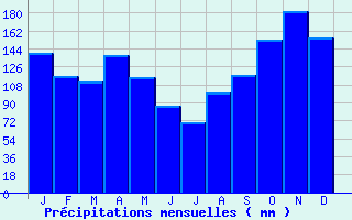 | Jan | Fev | Mars | Avr | Mai | Juin | Juil | Aout | Sept | Oct | Nov | Dec | Année | | Temp. max. (°C) | 12.8 | 13.4 | 15.4 | 16.5 | 19.5 | 22 | 24.2 | 24.8 | 23.4 | 20.6 | 16 | 13.4 | 18.5 | | Temp. moy. (°C) | 9.3 | 9.6 | 11.4 | 12.6 | 15.7 | 18.3 | 20.5 | 21 | 19.1 | 16.6 | 12.3 | 10 | 14.7 | | Temp. min. (°C) | 5.8 | 5.9 | 7.4 | 8.6 | 11.8 | 14.7 | 16.8 | 17.2 | 14.9 | 12.6 | 8.7 | 6.5 | 10.9 | | Jan | Fev | Mars | Avr | Mai | Juin | Juil | Aout | Sept | Oct | Nov | Dec | Année | | Jours Tx > 30°C | 0 | 0 | 0 | 0.1 | 0.7 | 1.3 | 1.7 | 1.9 | 1.7 | 0.3 | 0 | 0 | 7.8 | | Jours Tx > 25°C | 0 | 0.1 | 0.6 | 1.4 | 3.5 | 4.8 | 9.3 | 13.2 | 7.9 | 4.7 | 0.2 | 0 | 45.9 | | Jours Tx < 0°C | 0.2 | 0 | 0 | 0 | 0 | 0 | 0 | 0 | 0 | 0 | 0 | 0 | 0.2 | | Jours Tn < 0°C | 3.6 | 2.6 | 1.1 | 0 | 0 | 0 | 0 | 0 | 0 | 0 | 0.8 | 3 | 11.2 | | Jours Tn < -5°C | 0.3 | 0.1 | 0 | 0 | 0 | 0 | 0 | 0 | 0 | 0 | 0 | 0.1 | 0.7 | | Jours Tn < -10°C | 0 | 0 | 0 | 0 | 0 | 0 | 0 | 0 | 0 | 0 | 0 | 0 | 0 | | | | Jan | Fev | Mars | Avr | Mai | Juin | Juil | Aout | Sept | Oct | Nov | Dec | Année | | RR mensuel (mm) | 139 | 116.9 | 110.9 | 137 | 115.1 | 86.4 | 70.1 | 99.6 | 118 | 152.6 | 182 | 155.4 | 1483 | | Jan | Fev | Mars | Avr | Mai | Juin | Juil | Aout | Sept | Oct | Nov | Dec | Année | | Jours RR > 1mm | 13.4 | 11.9 | 12.3 | 14 | 12.4 | 10.5 | 8.6 | 9.8 | 9.7 | 12.2 | 13.1 | 12.5 | 140.4 | | Jours RR > 5mm | 8.5 | 7.3 | 6.6 | 8.1 | 6.8 | 4.9 | 3.9 | 5.2 | 5.8 | 7.7 | 9 | 8.2 | 82 | | Jours RR > 10mm | 5.4 | 4.1 | 3.9 | 5 | 3.7 | 2.7 | 2.2 | 3.1 | 3.7 | 5.2 | 6.3 | 5.5 | 50.8 | | | | Jan | Fev | Mars | Avr | Mai | Juin | Juil | Aout | Sept | Oct | Nov | Dec | Année | | Vent moyen (km/h) | 16.6 | 16.6 | 15.8 | 16.6 | 15.1 | 14.4 | 13.7 | 13.3 | 13.7 | 14.8 | 16.9 | 16.9 | 15.5 | | Jan | Fev | Mars | Avr | Mai | Juin | Juil | Aout | Sept | Oct | Nov | Dec | Année | | Jours rafales >= 58km/h | 11.4 | 9.3 | 9.7 | 9.6 | 6.6 | 3.8 | 3.8 | 3.9 | 5.7 | 9.5 | 10.8 | 10.3 | 94.2 | | Jours rafales >= 100km/h | 0.8 | 1.4 | 0.6 | 0.5 | 0.3 | 0.1 | 0 | 0.1 | 0.2 | 0.3 | 1.3 | 1.1 | 6.5 |