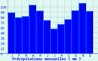 | Jan | Fev | Mars | Avr | Mai | Juin | Juil | Aout | Sept | Oct | Nov | Dec | Année | | Temp. max. (°C) | 11 | 12.2 | 15.2 | 16.8 | 20.5 | 23.6 | 25.8 | 25.9 | 23.8 | 19.8 | 14.3 | 11.6 | 18.4 | | Temp. moy. (°C) | 6.5 | 7.3 | 10 | 11.9 | 15.6 | 18.7 | 20.6 | 20.7 | 18.2 | 14.7 | 9.8 | 7.2 | 13.5 | | Temp. min. (°C) | 2.1 | 2.5 | 4.8 | 6.9 | 10.7 | 13.8 | 15.5 | 15.5 | 12.6 | 9.6 | 5.3 | 2.7 | 8.5 | | Jan | Fev | Mars | Avr | Mai | Juin | Juil | Aout | Sept | Oct | Nov | Dec | Année | | Jours Tx > 30°C | 0 | 0 | 0 | 0 | 0.8 | 3.2 | 5.8 | 5 | 2.6 | 0.4 | 0 | 0 | 17.7 | | Jours Tx > 25°C | 0 | 0.1 | 0.7 | 1.6 | 6.6 | 11.8 | 16.7 | 17.3 | 11.7 | 4.4 | 0.1 | 0.1 | 71 | | Jours Tx < 0°C | 0.8 | 0.2 | 0 | 0 | 0 | 0 | 0 | 0 | 0 | 0 | 0 | 0.2 | 1.2 | | Jours Tn < 0°C | 9.3 | 7.9 | 3.4 | 0.4 | 0 | 0 | 0 | 0 | 0 | 0.2 | 3.2 | 8.4 | 32.8 | | Jours Tn < -5°C | 1.4 | 0.6 | 0.2 | 0 | 0 | 0 | 0 | 0 | 0 | 0 | 0.3 | 0.9 | 3.3 | | Jours Tn < -10°C | 0.3 | 0 | 0 | 0 | 0 | 0 | 0 | 0 | 0 | 0 | 0 | 0 | 0.3 | | | | Jan | Fev | Mars | Avr | Mai | Juin | Juil | Aout | Sept | Oct | Nov | Dec | Année | | RR mensuel (mm) | 94.4 | 83.3 | 85.9 | 112.4 | 98.8 | 77.2 | 56.7 | 67.5 | 78.9 | 99.7 | 116.9 | 98.2 | 1069.9 | | Jan | Fev | Mars | Avr | Mai | Juin | Juil | Aout | Sept | Oct | Nov | Dec | Année | | Jours RR > 1mm | 11.5 | 10.3 | 10.4 | 13.1 | 12.8 | 9.7 | 7.9 | 8.3 | 8.5 | 11.1 | 10.9 | 11 | 125.4 | | Jours RR > 5mm | 6.4 | 5.4 | 5.5 | 7.1 | 6.3 | 4.5 | 3.4 | 3.8 | 4.8 | 5.9 | 6.8 | 6.2 | 66.1 | | Jours RR > 10mm | 3.3 | 3.1 | 2.9 | 3.9 | 3 | 2.4 | 1.9 | 2.3 | 2.7 | 3.6 | 4.3 | 3.6 | 36.9 | | | | Jan | Fev | Mars | Avr | Mai | Juin | Juil | Aout | Sept | Oct | Nov | Dec | Année | | Vent moyen (km/h) | 8.6 | 9.4 | 9.7 | 10.1 | 9.4 | 9 | 8.3 | 7.6 | 7.2 | 7.6 | 7.9 | 8.3 | 8.6 | | Jan | Fev | Mars | Avr | Mai | Juin | Juil | Aout | Sept | Oct | Nov | Dec | Année | | Jours rafales >= 58km/h | 3.3 | 3.7 | 3.7 | 3.7 | 2.1 | 1.3 | 1.6 | 1.3 | 1.3 | 2.1 | 2.4 | 3.3 | 29.8 | | Jours rafales >= 100km/h | 0 | 0.3 | 0 | 0 | 0 | 0 | 0 | 0 | 0 | 0 | 0 | 0.2 | 0.7 | | | | Jan | Fev | Mars | Avr | Mai | Juin | Juil | Aout | Sept | Oct | Nov | Dec | Année | | Ensoleillement (heures) | 104.8 | 121.1 | 164.6 | 165.6 | 185.8 | 195.7 | 207.8 | 203.7 | 183.8 | 143.9 | 104.6 | 95.9 | 1877.2 |