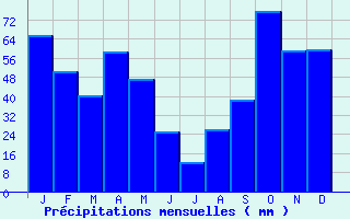 | Jan | Fev | Mars | Avr | Mai | Juin | Juil | Aout | Sept | Oct | Nov | Dec | Année | | Temp. max. (°C) | 12.4 | 13.2 | 16 | 18.2 | 21.8 | 26.2 | 29.2 | 28.9 | 25.4 | 21 | 15.9 | 13.1 | 20.1 | | Temp. moy. (°C) | 8.4 | 9 | 11.7 | 13.8 | 17.3 | 21.5 | 24.3 | 24.1 | 20.7 | 16.8 | 12 | 9.1 | 15.8 | | Temp. min. (°C) | 4.4 | 4.9 | 7.4 | 9.4 | 12.9 | 16.8 | 19.4 | 19.3 | 16 | 12.6 | 8.1 | 5.1 | 11.4 | | Jan | Fev | Mars | Avr | Mai | Juin | Juil | Aout | Sept | Oct | Nov | Dec | Année | | Jours Tx > 30°C | 0 | 0 | 0 | 0 | 0.3 | 4.2 | 12.4 | 10.9 | 2.2 | 0.3 | 0 | 0 | 30.3 | | Jours Tx > 25°C | 0 | 0 | 0.2 | 0.9 | 5.3 | 18.8 | 28.4 | 28.2 | 16.5 | 3.3 | 0 | 0 | 101.8 | | Jours Tx < 0°C | 0.1 | 0 | 0 | 0 | 0 | 0 | 0 | 0 | 0 | 0 | 0 | 0 | 0.2 | | Jours Tn < 0°C | 4.1 | 3.1 | 0.6 | 0 | 0 | 0 | 0 | 0 | 0 | 0 | 0.8 | 3.1 | 11.7 | | Jours Tn < -5°C | 0.3 | 0.1 | 0 | 0 | 0 | 0 | 0 | 0 | 0 | 0 | 0 | 0.1 | 0.5 | | Jours Tn < -10°C | 0 | 0 | 0 | 0 | 0 | 0 | 0 | 0 | 0 | 0 | 0 | 0 | 0 | | | | Jan | Fev | Mars | Avr | Mai | Juin | Juil | Aout | Sept | Oct | Nov | Dec | Année | | RR mensuel (mm) | 65.4 | 50.4 | 40.3 | 58.5 | 47.3 | 25 | 12.2 | 25.8 | 38.2 | 75.9 | 59.2 | 59.4 | 557.6 | | Jan | Fev | Mars | Avr | Mai | Juin | Juil | Aout | Sept | Oct | Nov | Dec | Année | | Jours RR > 1mm | 5.4 | 4.3 | 4.2 | 6 | 5.5 | 3.8 | 2.3 | 3.5 | 4.4 | 4.8 | 4.5 | 5.3 | 54 | | Jours RR > 5mm | 2.7 | 1.9 | 1.9 | 2.4 | 2.3 | 1.3 | 0.7 | 1.6 | 1.7 | 3.1 | 1.9 | 2.6 | 24.3 | | Jours RR > 10mm | 1.7 | 1.1 | 1 | 1.2 | 1.3 | 0.6 | 0.3 | 0.7 | 1.1 | 2.2 | 1.3 | 1.7 | 14.1 | | | | Jan | Fev | Mars | Avr | Mai | Juin | Juil | Aout | Sept | Oct | Nov | Dec | Année | | Vent moyen (km/h) | 17.3 | 18 | 19.4 | 19.4 | 16.2 | 16.6 | 16.6 | 15.5 | 14.8 | 14.8 | 16.6 | 16.9 | 16.9 | | Jan | Fev | Mars | Avr | Mai | Juin | Juil | Aout | Sept | Oct | Nov | Dec | Année | | Jours rafales >= 58km/h | 13.5 | 13 | 14.9 | 13.8 | 9.3 | 8.9 | 9.7 | 8.5 | 8 | 9.8 | 12.8 | 13.3 | 135.4 | | Jours rafales >= 100km/h | 1.7 | 1.5 | 1.2 | 1.2 | 0.4 | 0.2 | 0.2 | 0.1 | 0.1 | 0.3 | 0.9 | 2 | 10 | | | | Jan | Fev | Mars | Avr | Mai | Juin | Juil | Aout | Sept | Oct | Nov | Dec | Année | | Jours avec brouillard (*) | 0.9 | 1.3 | 1.5 | 1 | 0.6 | 0.5 | 0.6 | 0.8 | 1.6 | 1.9 | 0.9 | 1.2 | 12.8 | | Jours avec orage (*) | 0.7 | 0.1 | 0.2 | 1 | 2.4 | 3.1 | 3.7 | 4.3 | 3 | 1.9 | 0.9 | 0.4 | 21.8 | | Jours avec grêle (*) | 0 | 0 | 0 | 0 | 0 | 0 | 0 | 0.1 | 0.1 | 0 | 0 | 0 | 0.3 | | Jours avec neige (*) | 0.9 | 0.9 | 0.2 | 0 | 0 | 0 | 0 | 0 | 0 | 0 | 0 | 0.3 | 2.3 | | | | Jan | Fev | Mars | Avr | Mai | Juin | Juil | Aout | Sept | Oct | Nov | Dec | Année | | Ensoleillement (heures) | 141.2 | 160.8 | 209.6 | 218 | 235.8 | 268.9 | 298.2 | 267.4 | 222.2 | 167.6 | 149.2 | 126.1 | 2464.9 |