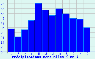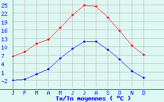 | Jan | Fev | Mars | Avr | Mai | Juin | Juil | Aout | Sept | Oct | Nov | Dec | Année | | Temp. max. (°C) | 6.7 | 8.2 | 11.1 | 12.7 | 16.8 | 21.4 | 24.9 | 24.4 | 20.5 | 15.7 | 10.4 | 7.2 | 15 | | Temp. moy. (°C) | 2.4 | 3.3 | 5.7 | 7.4 | 11.3 | 15.4 | 18.4 | 18.1 | 14.7 | 10.6 | 5.8 | 3.1 | 9.7 | | Temp. min. (°C) | -1.9 | -1.6 | 0.3 | 2.1 | 5.8 | 9.4 | 11.9 | 11.8 | 8.9 | 5.5 | 1.3 | -1.1 | 4.4 | | Jan | Fev | Mars | Avr | Mai | Juin | Juil | Aout | Sept | Oct | Nov | Dec | Année | | Jours Tx > 30°C | 0 | 0 | 0 | 0 | 0 | 0.5 | 2.2 | 2 | 0.1 | 0 | 0 | 0 | 4.8 | | Jours Tx > 25°C | 0 | 0 | 0 | 0 | 1 | 6.8 | 16.9 | 15.3 | 3.6 | 0.3 | 0 | 0 | 43.9 | | Jours Tx < 0°C | 2 | 1.5 | 0.7 | 0 | 0 | 0 | 0 | 0 | 0 | 0 | 0.2 | 1 | 5.4 | | Jours Tn < 0°C | 22.8 | 18.8 | 13.6 | 7.8 | 1.4 | 0.1 | 0 | 0 | 0.1 | 1.3 | 10.6 | 19.5 | 95.9 | | Jours Tn < -5°C | 4.8 | 5 | 2.8 | 0.3 | 0 | 0 | 0 | 0 | 0 | 0 | 1.7 | 3.9 | 18.5 | | Jours Tn < -10°C | 0.7 | 0.7 | 0.3 | 0 | 0 | 0 | 0 | 0 | 0 | 0 | 0.1 | 0.1 | 1.8 | | | | Jan | Fev | Mars | Avr | Mai | Juin | Juil | Aout | Sept | Oct | Nov | Dec | Année | | RR mensuel (mm) | 33.2 | 21.6 | 32.1 | 45.4 | 71.1 | 61 | 53.4 | 62.8 | 55.3 | 48.9 | 47.5 | 35 | 567.3 | | Jan | Fev | Mars | Avr | Mai | Juin | Juil | Aout | Sept | Oct | Nov | Dec | Année | | Jours RR > 1mm | 5.5 | 4.3 | 4.9 | 7.8 | 10 | 8.2 | 6.3 | 7.2 | 6.4 | 6 | 5.4 | 5.2 | 77.3 | | Jours RR > 5mm | 2.1 | 1.4 | 2.1 | 3 | 4.9 | 3.9 | 3.7 | 3.6 | 3.3 | 2.8 | 2.5 | 2 | 35.3 | | Jours RR > 10mm | 0.9 | 0.6 | 0.8 | 1.5 | 2.4 | 1.9 | 2 | 2 | 1.8 | 1.6 | 1.4 | 1.1 | 17.8 | | | | Jan | Fev | Mars | Avr | Mai | Juin | Juil | Aout | Sept | Oct | Nov | Dec | Année | | Vent moyen (km/h) | 9.7 | 11.5 | 12.6 | 13.3 | 11.9 | 10.8 | 10.8 | 10.1 | 9.7 | 9.4 | 10.1 | 9.4 | 10.8 | | Jan | Fev | Mars | Avr | Mai | Juin | Juil | Aout | Sept | Oct | Nov | Dec | Année | | Jours rafales >= 58km/h | 6.3 | 7.4 | 8.7 | 9.1 | 7.1 | 5.5 | 6.4 | 5.9 | 3.7 | 4.9 | 6.4 | 6.9 | 78.4 | | Jours rafales >= 100km/h | 0.4 | 0.3 | 0.1 | 0.1 | 0 | 0 | 0.2 | 0.2 | 0 | 0 | 0.2 | 0.2 | 1.7 |