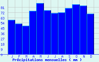 | Jan | Fev | Mars | Avr | Mai | Juin | Juil | Aout | Sept | Oct | Nov | Dec | Année | | Temp. max. (°C) | 5.5 | 7.6 | 12.3 | 15.7 | 20.1 | 23.9 | 26.6 | 26.2 | 21.9 | 16.5 | 9.9 | 6.1 | 16.1 | | Temp. moy. (°C) | 2.7 | 4.1 | 7.9 | 10.8 | 15.1 | 18.6 | 21 | 20.5 | 16.7 | 12.4 | 6.7 | 3.6 | 11.7 | | Temp. min. (°C) | 0 | 0.6 | 3.4 | 5.9 | 10.1 | 13.4 | 15.5 | 14.9 | 11.5 | 8.3 | 3.6 | 1 | 7.4 | | Jan | Fev | Mars | Avr | Mai | Juin | Juil | Aout | Sept | Oct | Nov | Dec | Année | | Jours Tx > 30°C | 0 | 0 | 0 | 0 | 0.2 | 3 | 7.1 | 6.2 | 0.4 | 0 | 0 | 0 | 16.9 | | Jours Tx > 25°C | 0 | 0 | 0 | 0.6 | 4.7 | 12.7 | 19.8 | 18.2 | 7.4 | 0.8 | 0 | 0 | 64.3 | | Jours Tx < 0°C | 4.2 | 2.1 | 0 | 0 | 0 | 0 | 0 | 0 | 0 | 0 | 0.6 | 2.9 | 9.8 | | Jours Tn < 0°C | 15 | 13 | 6.1 | 0.7 | 0 | 0 | 0 | 0 | 0 | 0.9 | 6 | 12 | 53.6 | | Jours Tn < -5°C | 3.5 | 2.2 | 0.1 | 0 | 0 | 0 | 0 | 0 | 0 | 0 | 0.7 | 2.3 | 8.7 | | Jours Tn < -10°C | 0.7 | 0.2 | 0 | 0 | 0 | 0 | 0 | 0 | 0 | 0 | 0 | 0.2 | 1.2 | | | | Jan | Fev | Mars | Avr | Mai | Juin | Juil | Aout | Sept | Oct | Nov | Dec | Année | | RR mensuel (mm) | 59 | 52.5 | 48.7 | 74.6 | 88.1 | 75.5 | 70.9 | 71.7 | 79.5 | 85.5 | 83.8 | 69.5 | 859.3 | | Jan | Fev | Mars | Avr | Mai | Juin | Juil | Aout | Sept | Oct | Nov | Dec | Année | | Jours RR > 1mm | 10.3 | 8.8 | 8.9 | 10.1 | 10.9 | 8.9 | 8.2 | 8.2 | 8.1 | 10.4 | 10.5 | 10.7 | 113.9 | | Jours RR > 5mm | 3.9 | 3.3 | 3.1 | 4.6 | 5.6 | 4.6 | 4.3 | 3.9 | 4.1 | 5.6 | 4.7 | 5.1 | 52.8 | | Jours RR > 10mm | 1.5 | 1.3 | 1.1 | 2 | 2.6 | 2.6 | 2.3 | 2.2 | 2.6 | 2.8 | 2.3 | 1.9 | 25.3 | | | | Jan | Fev | Mars | Avr | Mai | Juin | Juil | Aout | Sept | Oct | Nov | Dec | Année | | Vent moyen (km/h) | 9 | 9.7 | 10.8 | 11.2 | 9.7 | 9.4 | 9.4 | 8.6 | 8.3 | 8.3 | 8.6 | 9.4 | 9.4 | | Jan | Fev | Mars | Avr | Mai | Juin | Juil | Aout | Sept | Oct | Nov | Dec | Année | | Jours rafales >= 58km/h | 3.3 | 3.3 | 3.3 | 3.6 | 2.3 | 1.7 | 2.1 | 1.6 | 1 | 2.4 | 2.4 | 2.7 | 29.8 | | Jours rafales >= 100km/h | 0.1 | 0.1 | 0 | 0 | 0 | 0 | 0.1 | 0 | 0 | 0 | 0.1 | 0.1 | 0.6 | | | | Jan | Fev | Mars | Avr | Mai | Juin | Juil | Aout | Sept | Oct | Nov | Dec | Année | | Ensoleillement (heures) | 61.9 | 91.5 | 154.9 | 182 | 212.9 | 245.3 | 267.7 | 242.4 | 185.6 | 116.9 | 70.3 | 50.5 | 1881.9 |