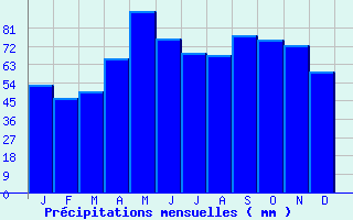 | Jan | Fev | Mars | Avr | Mai | Juin | Juil | Aout | Sept | Oct | Nov | Dec | Année | | Temp. max. (°C) | 6.5 | 8.2 | 12.4 | 15.6 | 19.8 | 23.3 | 26.3 | 25.9 | 21.7 | 16.9 | 10.5 | 6.9 | 16.2 | | Temp. moy. (°C) | 3.1 | 4 | 7.2 | 9.8 | 14 | 17.3 | 19.9 | 19.5 | 15.7 | 12 | 6.6 | 3.6 | 11.1 | | Temp. min. (°C) | -0.4 | -0.3 | 1.9 | 4.1 | 8.2 | 11.3 | 13.4 | 13 | 9.7 | 7.1 | 2.7 | 0.4 | 6 | | Jan | Fev | Mars | Avr | Mai | Juin | Juil | Aout | Sept | Oct | Nov | Dec | Année | | Jours Tx > 30°C | 0 | 0 | 0 | 0 | 0.3 | 3 | 6.7 | 6.3 | 0.9 | 0 | 0 | 0 | 17.2 | | Jours Tx > 25°C | 0 | 0 | 0 | 0.6 | 4.9 | 11.3 | 18.2 | 17.1 | 7.2 | 1.2 | 0 | 0 | 60.5 | | Jours Tx < 0°C | 3.2 | 1.6 | 0 | 0 | 0 | 0 | 0 | 0 | 0 | 0 | 0.7 | 2.4 | 7.8 | | Jours Tn < 0°C | 15.5 | 15.1 | 10.9 | 4.5 | 0.2 | 0 | 0 | 0 | 0.1 | 2.3 | 8.5 | 14.7 | 71.8 | | Jours Tn < -5°C | 5 | 4.1 | 1.7 | 0.1 | 0 | 0 | 0 | 0 | 0 | 0.2 | 1.7 | 4.2 | 16.9 | | Jours Tn < -10°C | 1 | 0.4 | 0.1 | 0 | 0 | 0 | 0 | 0 | 0 | 0 | 0.1 | 0.5 | 2.1 | | | | Jan | Fev | Mars | Avr | Mai | Juin | Juil | Aout | Sept | Oct | Nov | Dec | Année | | RR mensuel (mm) | 52.9 | 46.5 | 49.8 | 65.6 | 89.4 | 75.5 | 68.4 | 67.3 | 77.1 | 75.2 | 72.2 | 59.5 | 799.4 | | Jan | Fev | Mars | Avr | Mai | Juin | Juil | Aout | Sept | Oct | Nov | Dec | Année | | Jours RR > 1mm | 10.7 | 8.9 | 9.5 | 10.5 | 11.7 | 9.2 | 8.3 | 8.2 | 8.9 | 10.6 | 10.9 | 11.3 | 118.6 | | Jours RR > 5mm | 3.5 | 3.2 | 3.1 | 4.4 | 5.7 | 5.2 | 4 | 4.2 | 4.4 | 5.2 | 4.9 | 3.9 | 51.8 | | Jours RR > 10mm | 1.1 | 1 | 1 | 1.6 | 2.8 | 2.4 | 2.2 | 2.2 | 2.7 | 2.1 | 1.9 | 1.4 | 22.4 | | | | Jan | Fev | Mars | Avr | Mai | Juin | Juil | Aout | Sept | Oct | Nov | Dec | Année | | Vent moyen (km/h) | 9.7 | 9.7 | 10.4 | 9.7 | 8.3 | 7.9 | 7.9 | 7.2 | 6.8 | 7.9 | 8.3 | 9 | 8.6 | | Jan | Fev | Mars | Avr | Mai | Juin | Juil | Aout | Sept | Oct | Nov | Dec | Année | | Jours rafales >= 58km/h | 3.2 | 3.6 | 3.6 | 3.3 | 2.2 | 1.5 | 2.1 | 1.6 | 1.8 | 2.8 | 3 | 3.3 | 31.9 | | Jours rafales >= 100km/h | 0 | 0.1 | 0 | 0 | 0 | 0 | 0 | 0 | 0 | 0.1 | 0.1 | 0.2 | 0.6 | | | | Jan | Fev | Mars | Avr | Mai | Juin | Juil | Aout | Sept | Oct | Nov | Dec | Année | | Jours avec brouillard (*) | -- | 6 | 4.6 | 3.9 | 6.1 | 5.9 | 4.4 | -- | 11 | 13.2 | 10.7 | -- | -- | | | | Jan | Fev | Mars | Avr | Mai | Juin | Juil | Aout | Sept | Oct | Nov | Dec | Année | | Ensoleillement (heures) | 65.3 | 88.7 | 146.6 | 167.7 | 197.9 | 226.9 | 247.6 | 230.3 | 167 | 111.8 | 66.1 | 52.1 | 1767.7 |