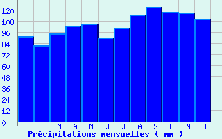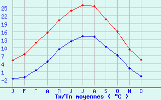 | Jan | Fev | Mars | Avr | Mai | Juin | Juil | Aout | Sept | Oct | Nov | Dec | Année | | Temp. max. (°C) | 5.4 | 7.6 | 12 | 15.6 | 20.4 | 24 | 26.1 | 25.7 | 20.7 | 16 | 9.5 | 5.6 | 15.8 | | Temp. moy. (°C) | 1.9 | 3.3 | 6.8 | 10.2 | 14.9 | 18.2 | 20.2 | 19.9 | 15.5 | 11.6 | 5.9 | 2.5 | 10.9 | | Temp. min. (°C) | -1.6 | -1 | 1.6 | 4.7 | 9.4 | 12.5 | 14.3 | 14.1 | 10.4 | 7.2 | 2.3 | -0.7 | 6.1 | | Jan | Fev | Mars | Avr | Mai | Juin | Juil | Aout | Sept | Oct | Nov | Dec | Année | | Jours Tx > 30°C | 0 | 0 | 0 | 0 | 0.1 | 2.7 | 6.1 | 6 | 0.1 | 0 | 0 | 0 | 15 | | Jours Tx > 25°C | 0 | 0 | 0 | 0.7 | 4.7 | 13.4 | 19.2 | 17 | 4.6 | 0.3 | 0 | 0 | 59.9 | | Jours Tx < 0°C | 3.1 | 1.2 | 0.1 | 0 | 0 | 0 | 0 | 0 | 0 | 0 | 0.2 | 2.4 | 7 | | Jours Tn < 0°C | 19.7 | 17.5 | 10.8 | 2.2 | 0.1 | 0 | 0 | 0 | 0 | 1.3 | 8.6 | 16.8 | 77 | | Jours Tn < -5°C | 5.7 | 3.7 | 1.4 | 0 | 0 | 0 | 0 | 0 | 0 | 0 | 0.9 | 4.5 | 16.1 | | Jours Tn < -10°C | 0.5 | 0.2 | 0.1 | 0 | 0 | 0 | 0 | 0 | 0 | 0 | 0.1 | 0.4 | 1.3 | | | | Jan | Fev | Mars | Avr | Mai | Juin | Juil | Aout | Sept | Oct | Nov | Dec | Année | | RR mensuel (mm) | 91.2 | 82.1 | 94.6 | 102.8 | 105.1 | 90 | 100.8 | 114.8 | 123.3 | 118 | 116.8 | 109.9 | 1249.4 | | Jan | Fev | Mars | Avr | Mai | Juin | Juil | Aout | Sept | Oct | Nov | Dec | Année | | Jours RR > 1mm | 11.2 | 9.4 | 10.2 | 10.3 | 11.6 | 9.1 | 9.6 | 10.2 | 9.1 | 11.4 | 11.7 | 11 | 124.6 | | Jours RR > 5mm | 5.9 | 5.3 | 6.3 | 6.4 | 6.7 | 5.6 | 5.6 | 6.8 | 5.9 | 7.2 | 7 | 7.5 | 76.1 | | Jours RR > 10mm | 3.4 | 2.9 | 3.4 | 4.5 | 4.1 | 3.4 | 4.1 | 3.8 | 3.9 | 4.4 | 4.5 | 4.1 | 46.6 | | | | Jan | Fev | Mars | Avr | Mai | Juin | Juil | Aout | Sept | Oct | Nov | Dec | Année | | Vent moyen (km/h) | 6.1 | 6.8 | 7.9 | 8.3 | 7.6 | 7.9 | 7.9 | 7.2 | 6.8 | 6.1 | 5.8 | 6.1 | 7.2 | | Jan | Fev | Mars | Avr | Mai | Juin | Juil | Aout | Sept | Oct | Nov | Dec | Année | | Jours rafales >= 58km/h | 1.4 | -- | 1.6 | 1.6 | 1.1 | 1.9 | 1.8 | -- | -- | 0.9 | 1.1 | 1.2 | -- | | Jours rafales >= 100km/h | 0.1 | -- | 0 | 0 | 0 | 0 | 0.1 | -- | -- | 0 | 0 | 0.1 | -- | | | | Jan | Fev | Mars | Avr | Mai | Juin | Juil | Aout | Sept | Oct | Nov | Dec | Année | | Ensoleillement (heures) | 90.8 | 114.7 | 169.4 | 193.6 | 221 | 259.7 | 274.6 | 241.2 | 190.3 | 142.6 | 86.7 | 68.7 | 2053.1 |