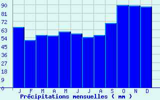 | Jan | Fev | Mars | Avr | Mai | Juin | Juil | Aout | Sept | Oct | Nov | Dec | Année | | Temp. max. (°C) | 7.5 | 7.9 | 10.3 | 12.3 | 15.4 | 17.9 | 20.1 | 20.7 | 18.9 | 15.6 | 11.1 | 7.9 | 13.8 | | Temp. moy. (°C) | 5.2 | 5.2 | 7.4 | 9.1 | 12.2 | 14.9 | 17 | 17.4 | 15.4 | 12.5 | 8.5 | 5.6 | 10.9 | | Temp. min. (°C) | 2.8 | 2.6 | 4.5 | 5.8 | 9 | 11.8 | 13.9 | 14 | 11.9 | 9.4 | 6 | 3.4 | 8 | | Jan | Fev | Mars | Avr | Mai | Juin | Juil | Aout | Sept | Oct | Nov | Dec | Année | | Jours Tx > 30°C | 0 | 0 | 0 | 0 | 0 | 0.4 | 0.4 | 0.6 | 0.1 | 0 | 0 | 0 | 1.6 | | Jours Tx > 25°C | 0 | 0 | 0 | 0.1 | 1 | 1.5 | 2.3 | 2.8 | 1.2 | 0.3 | 0 | 0 | 9.1 | | Jours Tx < 0°C | 1.5 | 0.6 | 0 | 0 | 0 | 0 | 0 | 0 | 0 | 0 | 0.1 | 0.5 | 2.8 | | Jours Tn < 0°C | 7.2 | 8.1 | 3.5 | 1 | 0 | 0 | 0 | 0 | 0 | 0.4 | 2.9 | 7.6 | 30.7 | | Jours Tn < -5°C | 2.2 | 1.4 | 0.1 | 0 | 0 | 0 | 0 | 0 | 0 | 0 | 0.2 | 0.7 | 4.6 | | Jours Tn < -10°C | 0.3 | 0.2 | 0 | 0 | 0 | 0 | 0 | 0 | 0 | 0 | 0 | 0 | 0.6 | | | | Jan | Fev | Mars | Avr | Mai | Juin | Juil | Aout | Sept | Oct | Nov | Dec | Année | | RR mensuel (mm) | 65.8 | 51.5 | 56.7 | 56.6 | 60.6 | 58.6 | 54.7 | 57 | 69.9 | 89.8 | 89.2 | 87.8 | 798.2 | | Jan | Fev | Mars | Avr | Mai | Juin | Juil | Aout | Sept | Oct | Nov | Dec | Année | | Jours RR > 1mm | 12.3 | 10.1 | 11.3 | 10.1 | 10.1 | 9.3 | 8.8 | 8.7 | 10.3 | 12.4 | 13.6 | 13.4 | 130.5 | | Jours RR > 5mm | 4.5 | 3.5 | 3.8 | 4.2 | 4.1 | 4.1 | 3.3 | 3.9 | 5.1 | 6 | 6.2 | 6.4 | 55.2 | | Jours RR > 10mm | 1.7 | 1 | 1 | 1.3 | 1.5 | 1.5 | 1.6 | 1.5 | 1.8 | 2.8 | 2.9 | 2.8 | 21.4 | | | | Jan | Fev | Mars | Avr | Mai | Juin | Juil | Aout | Sept | Oct | Nov | Dec | Année | | Vent moyen (km/h) | 22 | 20.2 | 19.8 | 17.6 | 16.2 | 15.8 | 15.5 | 15.8 | 16.9 | 18.7 | 20.2 | 20.5 | 18.4 | | Jan | Fev | Mars | Avr | Mai | Juin | Juil | Aout | Sept | Oct | Nov | Dec | Année | | Jours rafales >= 58km/h | 14 | -- | 11.4 | 8.8 | 7.3 | 5.1 | -- | -- | 7.4 | -- | 11.1 | 11.9 | -- | | Jours rafales >= 100km/h | 1.4 | -- | 0.7 | 0.2 | 0.1 | 0 | -- | -- | 0.1 | -- | 0.5 | 1.1 | -- |