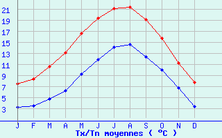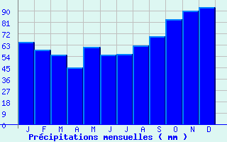 | Jan | Fev | Mars | Avr | Mai | Juin | Juil | Aout | Sept | Oct | Nov | Dec | Année | | Temp. max. (°C) | 7.5 | 8.4 | 10.6 | 13.1 | 16.6 | 19.4 | 21.1 | 21.4 | 19.1 | 15.7 | 11.2 | 7.7 | 14.3 | | Temp. moy. (°C) | 5.3 | 5.9 | 7.6 | 9.7 | 13 | 15.7 | 17.6 | 18 | 15.7 | 12.8 | 9 | 5.5 | 11.3 | | Temp. min. (°C) | 3.2 | 3.5 | 4.7 | 6.2 | 9.3 | 11.9 | 14.1 | 14.6 | 12.4 | 10 | 6.7 | 3.4 | 8.4 | | Jan | Fev | Mars | Avr | Mai | Juin | Juil | Aout | Sept | Oct | Nov | Dec | Année | | Jours Tx > 30°C | 0 | 0 | 0 | 0 | 0.1 | 0.8 | 0.7 | 1.2 | 0.2 | 0 | 0 | 0 | 3 | | Jours Tx > 25°C | 0 | 0 | 0 | 0.1 | 1.4 | 3 | 4.9 | 4.9 | 1.4 | 0.1 | 0 | 0 | 15.8 | | Jours Tx < 0°C | 1 | 0.2 | 0 | 0 | 0 | 0 | 0 | 0 | 0 | 0 | 0.1 | 0.8 | 2.1 | | Jours Tn < 0°C | 6.9 | 5.4 | 2.4 | 0.8 | 0 | 0 | 0 | 0 | 0 | 0.2 | 1.5 | 7.8 | 25 | | Jours Tn < -5°C | 1.4 | 0.3 | 0 | 0 | 0 | 0 | 0 | 0 | 0 | 0 | 0.1 | 0.8 | 2.5 | | Jours Tn < -10°C | 0.1 | 0 | 0 | 0 | 0 | 0 | 0 | 0 | 0 | 0 | 0 | 0 | 0.1 | | | | Jan | Fev | Mars | Avr | Mai | Juin | Juil | Aout | Sept | Oct | Nov | Dec | Année | | RR mensuel (mm) | 65.5 | 59.1 | 55.1 | 44.8 | 61.4 | 55.2 | 55.5 | 62.4 | 69.9 | 83.6 | 90.2 | 93.3 | 796 | | Jan | Fev | Mars | Avr | Mai | Juin | Juil | Aout | Sept | Oct | Nov | Dec | Année | | Jours RR > 1mm | 12.7 | 11.3 | 9.9 | 9.2 | 9.6 | 8.1 | 8.2 | 8.8 | 9.7 | 12.3 | 14.6 | 13.8 | 128.1 | | Jours RR > 5mm | 4.2 | 4.5 | 4.1 | 3 | 5 | 3.7 | 3.1 | 4.2 | 4.8 | 5.9 | 5.8 | 6.7 | 55 | | Jours RR > 10mm | 1.7 | 1.7 | 1.3 | 0.7 | 1.8 | 1.4 | 1.3 | 2.4 | 2.4 | 2.5 | 2.4 | 2.7 | 22.2 | | | | Jan | Fev | Mars | Avr | Mai | Juin | Juil | Aout | Sept | Oct | Nov | Dec | Année | | Vent moyen (km/h) | 21.6 | 20.5 | 19.1 | 17.6 | 16.9 | 15.5 | 16.2 | 15.8 | 16.9 | 19.1 | 20.2 | 20.2 | 18.4 | | Jan | Fev | Mars | Avr | Mai | Juin | Juil | Aout | Sept | Oct | Nov | Dec | Année | | Jours rafales >= 58km/h | 11.6 | 9.6 | 8.7 | 6.6 | -- | 2.5 | 3.8 | 3.6 | -- | -- | -- | -- | -- | | Jours rafales >= 100km/h | 1.3 | 0.3 | 0.2 | 0.2 | -- | 0.1 | 0 | 0.1 | -- | -- | -- | -- | -- |