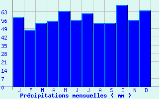 | Jan | Fev | Mars | Avr | Mai | Juin | Juil | Aout | Sept | Oct | Nov | Dec | Année | | Temp. max. (°C) | 6.3 | 7.5 | 11.5 | 14.8 | 18.7 | 22 | 24.6 | 24.4 | 20.6 | 15.7 | 10.1 | 6.7 | 15.3 | | Temp. moy. (°C) | 3.7 | 4.2 | 7.4 | 9.9 | 13.7 | 16.8 | 19.1 | 18.8 | 15.5 | 11.7 | 7 | 4.2 | 11 | | Temp. min. (°C) | 1.1 | 1 | 3.2 | 5.1 | 8.7 | 11.6 | 13.5 | 13.2 | 10.4 | 7.7 | 3.9 | 1.8 | 6.8 | | Jan | Fev | Mars | Avr | Mai | Juin | Juil | Aout | Sept | Oct | Nov | Dec | Année | | Jours Tx > 30°C | 0 | 0 | 0 | 0 | 0.1 | 1.3 | 3.5 | 3.1 | 0.3 | 0 | 0 | 0 | 8.4 | | Jours Tx > 25°C | 0 | 0 | 0 | 0.5 | 3.1 | 7.7 | 14.1 | 12.3 | 4.2 | 0.3 | 0 | 0 | 42.3 | | Jours Tx < 0°C | 2.6 | 1.6 | 0.1 | 0 | 0 | 0 | 0 | 0 | 0 | 0 | 0.3 | 1.6 | 6.1 | | Jours Tn < 0°C | 12.3 | 12.3 | 6.7 | 2.5 | 0 | 0 | 0 | 0 | 0 | 1.3 | 5.7 | 11.4 | 52.2 | | Jours Tn < -5°C | 3 | 2.1 | 0.1 | 0 | 0 | 0 | 0 | 0 | 0 | 0 | 0.6 | 1.6 | 7.3 | | Jours Tn < -10°C | 0.7 | 0.2 | 0 | 0 | 0 | 0 | 0 | 0 | 0 | 0 | 0 | 0.1 | 1 | | | | Jan | Fev | Mars | Avr | Mai | Juin | Juil | Aout | Sept | Oct | Nov | Dec | Année | | RR mensuel (mm) | 58.2 | 47.7 | 53.1 | 55.3 | 63.5 | 55.5 | 61.7 | 53 | 53 | 68.8 | 56.1 | 63.9 | 689.8 | | Jan | Fev | Mars | Avr | Mai | Juin | Juil | Aout | Sept | Oct | Nov | Dec | Année | | Jours RR > 1mm | 11 | 9.7 | 10.8 | 9.7 | 10.8 | 8.7 | 8.3 | 7.7 | 8.3 | 10.4 | 10.9 | 11.2 | 117.6 | | Jours RR > 5mm | 3.9 | 3.2 | 3.6 | 3.8 | 4.4 | 3.8 | 3.8 | 3.2 | 3.5 | 4.3 | 3.9 | 4.7 | 46.1 | | Jours RR > 10mm | 1.3 | 1 | 0.9 | 1.5 | 1.5 | 1.7 | 1.7 | 1.6 | 1.7 | 1.8 | 1.3 | 1.6 | 17.6 | | | | Jan | Fev | Mars | Avr | Mai | Juin | Juil | Aout | Sept | Oct | Nov | Dec | Année | | Vent moyen (km/h) | 15.8 | 15.1 | 15.1 | 14 | 13 | 11.9 | 11.5 | 11.2 | 11.9 | 13 | 13.7 | 14.8 | 13.3 | | Jan | Fev | Mars | Avr | Mai | Juin | Juil | Aout | Sept | Oct | Nov | Dec | Année | | Jours rafales >= 58km/h | 7.2 | 5.9 | 6.2 | 4.1 | 2.1 | 2.1 | 2 | 2 | 2.2 | 4.1 | 4.2 | 5.9 | 48 | | Jours rafales >= 100km/h | 0.3 | 0.2 | 0 | 0.1 | 0 | 0 | 0 | 0 | 0 | 0.1 | 0.1 | 0.2 | 1 | | | | Jan | Fev | Mars | Avr | Mai | Juin | Juil | Aout | Sept | Oct | Nov | Dec | Année | | Jours avec brouillard (*) | 6.3 | 4.6 | 2.9 | 2.4 | 1.8 | 1.3 | 1.1 | 2.2 | 3.1 | 5.9 | 6.7 | 7 | 45.1 | | Jours avec orage (*) | 0.1 | 0.2 | 0.5 | 1.1 | 2.4 | 2.6 | 3.1 | 2.9 | 1.1 | 0.3 | 0.1 | 0.1 | 14.6 | | Jours avec grêle (*) | 0.2 | 0.3 | 0.5 | 0.6 | 0.1 | 0.2 | 0.1 | 0 | 0 | 0.3 | 0.1 | 0.2 | 2.6 | | Jours avec neige (*) | 3.6 | 4.4 | 2 | 0.9 | 0 | 0 | 0 | 0 | 0 | 0 | 1.1 | 3.2 | 15.3 |