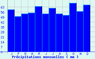 | Jan | Fev | Mars | Avr | Mai | Juin | Juil | Aout | Sept | Oct | Nov | Dec | Année | | Temp. max. (°C) | 6.4 | 7.6 | 11.5 | 14.7 | 18.5 | 21.7 | 24.3 | 24.2 | 20.5 | 15.7 | 10.1 | 6.7 | 15.2 | | Temp. moy. (°C) | 3.9 | 4.4 | 7.5 | 10.1 | 13.8 | 16.9 | 19.2 | 19 | 15.8 | 11.9 | 7.2 | 4.3 | 11.2 | | Temp. min. (°C) | 1.3 | 1.3 | 3.6 | 5.5 | 9.1 | 12.1 | 14 | 13.8 | 11 | 8.2 | 4.3 | 2 | 7.2 | | Jan | Fev | Mars | Avr | Mai | Juin | Juil | Aout | Sept | Oct | Nov | Dec | Année | | Jours Tx > 30°C | 0 | 0 | 0 | 0 | 0 | 1.2 | 3.1 | 2.9 | 0.2 | 0 | 0 | 0 | 7.4 | | Jours Tx > 25°C | 0 | 0 | 0 | 0.4 | 2.8 | 6.9 | 13.3 | 11.7 | 3.8 | 0.3 | 0 | 0 | 39.3 | | Jours Tx < 0°C | 2.5 | 1.5 | 0.1 | 0 | 0 | 0 | 0 | 0 | 0 | 0 | 0.3 | 1.6 | 5.9 | | Jours Tn < 0°C | 11.6 | 11.1 | 5.7 | 1.7 | 0 | 0 | 0 | 0 | 0 | 0.7 | 4.9 | 10.6 | 46.2 | | Jours Tn < -5°C | 2.8 | 1.8 | 0.1 | 0 | 0 | 0 | 0 | 0 | 0 | 0 | 0.4 | 1.1 | 6.2 | | Jours Tn < -10°C | 0.6 | 0.1 | 0 | 0 | 0 | 0 | 0 | 0 | 0 | 0 | 0 | 0 | 0.7 | | | | Jan | Fev | Mars | Avr | Mai | Juin | Juil | Aout | Sept | Oct | Nov | Dec | Année | | RR mensuel (mm) | 59.4 | 50 | 53.7 | 54.9 | 63.9 | 53.7 | 61.7 | 53.7 | 51.4 | 68.8 | 57.1 | 65.9 | 694.2 | | Jan | Fev | Mars | Avr | Mai | Juin | Juil | Aout | Sept | Oct | Nov | Dec | Année | | Jours RR > 1mm | 11.1 | 10.1 | 10.9 | 9.6 | 10.6 | 8.6 | 8.3 | 7.8 | 8.3 | 10.4 | 10.9 | 11.7 | 118.5 | | Jours RR > 5mm | 4.1 | 3.3 | 3.9 | 3.8 | 4.4 | 4 | 3.8 | 3.3 | 3.6 | 4.4 | 3.7 | 4.7 | 47.1 | | Jours RR > 10mm | 1.3 | 1 | 0.8 | 1.5 | 1.6 | 1.4 | 2 | 1.3 | 1.6 | 1.7 | 1.6 | 1.6 | 17.5 | | | | Jan | Fev | Mars | Avr | Mai | Juin | Juil | Aout | Sept | Oct | Nov | Dec | Année | | Jours avec brouillard (*) | 6.8 | 5 | 2.4 | 1.9 | 1.9 | 0.8 | 0.8 | 2.1 | 2.2 | 5.1 | 7.4 | 8.6 | 44.9 | | Jours avec orage (*) | 0.1 | 0.3 | 0.5 | 1.9 | 3.6 | 3 | 4.5 | 3.5 | 1.6 | 0.7 | 0.1 | 0.2 | 19.9 | | Jours avec grêle (*) | 0.2 | 0.4 | 0.7 | 1 | 0.5 | 0 | 0.2 | 0.1 | 0 | 0.2 | 0.1 | 0.2 | 3.8 | | Jours avec neige (*) | 3.8 | 4.6 | 2.7 | 1 | 0 | 0 | 0 | 0 | 0 | 0.1 | 1.1 | 2.9 | 16.2 |