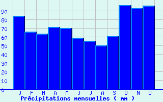 | Jan | Fev | Mars | Avr | Mai | Juin | Juil | Aout | Sept | Oct | Nov | Dec | Année | | Temp. max. (°C) | 8.5 | 10 | 13.4 | 16 | 20 | 23.7 | 26.1 | 26.1 | 22.9 | 18 | 12.2 | 8.9 | 17.2 | | Temp. moy. (°C) | 5.5 | 6.1 | 8.7 | 10.9 | 14.7 | 18 | 20.2 | 20.1 | 17.2 | 13.6 | 8.6 | 5.9 | 12.5 | | Temp. min. (°C) | 2.4 | 2.3 | 4 | 5.7 | 9.4 | 12.4 | 14.3 | 14 | 11.6 | 9.3 | 5.1 | 2.9 | 7.8 | | Jan | Fev | Mars | Avr | Mai | Juin | Juil | Aout | Sept | Oct | Nov | Dec | Année | | Jours Tx > 30°C | 0 | 0 | 0 | 0 | 0.5 | 3 | 6.3 | 5.3 | 1.6 | 0 | 0 | 0 | 16.8 | | Jours Tx > 25°C | 0 | 0 | 0 | 0.9 | 4.7 | 10.9 | 18 | 17.4 | 8.1 | 1.6 | 0 | 0 | 61.5 | | Jours Tx < 0°C | 1.6 | 0.5 | 0 | 0 | 0 | 0 | 0 | 0 | 0 | 0 | 0.1 | 0.4 | 2.6 | | Jours Tn < 0°C | 9.3 | 9.3 | 5.5 | 1.4 | 0 | 0 | 0 | 0 | 0 | 0.5 | 4.5 | 8.9 | 39.4 | | Jours Tn < -5°C | 2.1 | 1 | 0.2 | 0 | 0 | 0 | 0 | 0 | 0 | 0 | 0.3 | 0.9 | 4.5 | | Jours Tn < -10°C | 0.4 | 0.1 | 0 | 0 | 0 | 0 | 0 | 0 | 0 | 0 | 0 | 0 | 0.5 | | | | Jan | Fev | Mars | Avr | Mai | Juin | Juil | Aout | Sept | Oct | Nov | Dec | Année | | RR mensuel (mm) | 84.4 | 66.1 | 63.8 | 71.3 | 69.9 | 59.2 | 55.5 | 50.3 | 60.5 | 96.8 | 93.2 | 96.2 | 867.2 | | Jan | Fev | Mars | Avr | Mai | Juin | Juil | Aout | Sept | Oct | Nov | Dec | Année | | Jours RR > 1mm | 12.3 | 9.9 | 10.4 | 10.6 | 11.2 | 8 | 7.4 | 6.5 | 7.7 | 11.5 | 11.9 | 12.3 | 119.6 | | Jours RR > 5mm | 5.9 | 4.5 | 4.2 | 5.1 | 4.4 | 3.6 | 3.3 | 2.9 | 4 | 5.8 | 6.1 | 6.8 | 56.7 | | Jours RR > 10mm | 2.5 | 2 | 1.7 | 2.2 | 2.3 | 1.8 | 1.6 | 1.6 | 2 | 3.3 | 3 | 3.4 | 27.3 | | | | Jan | Fev | Mars | Avr | Mai | Juin | Juil | Aout | Sept | Oct | Nov | Dec | Année | | Vent moyen (km/h) | 16.2 | 15.5 | 15.1 | 14.8 | 13.3 | 12.6 | 12.6 | 11.9 | 12.6 | 14 | 14 | 15.5 | 14 | | Jan | Fev | Mars | Avr | Mai | Juin | Juil | Aout | Sept | Oct | Nov | Dec | Année | | Jours rafales >= 58km/h | 6.2 | 5.1 | 5.4 | 4.4 | 2.4 | 2 | 1.5 | 1.1 | 2.3 | 3.4 | 3.9 | 5.5 | 43.3 | | Jours rafales >= 100km/h | 0.3 | 0.3 | 0.1 | 0 | 0 | 0 | 0 | 0 | 0 | 0 | 0 | 0.2 | 1 | | | | Jan | Fev | Mars | Avr | Mai | Juin | Juil | Aout | Sept | Oct | Nov | Dec | Année | | Ensoleillement (heures) | 78 | 106 | 157.7 | 180.1 | 215 | 243.2 | 251 | 247.5 | 203.2 | 133 | 90.2 | 75.4 | 1980.3 |
