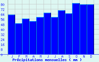 | Jan | Fev | Mars | Avr | Mai | Juin | Juil | Aout | Sept | Oct | Nov | Dec | Année | | Temp. max. (°C) | 6.4 | 7.1 | 10.4 | 13.4 | 16.9 | 19.4 | 21.9 | 22.2 | 19.2 | 15 | 10.1 | 6.7 | 14.1 | | Temp. moy. (°C) | 4.1 | 4.4 | 7.1 | 9.2 | 12.6 | 15.2 | 17.5 | 17.7 | 15.1 | 11.7 | 7.5 | 4.5 | 10.6 | | Temp. min. (°C) | 1.7 | 1.6 | 3.7 | 5 | 8.3 | 10.9 | 13.1 | 13.2 | 10.9 | 8.4 | 4.8 | 2.3 | 7 | | Jan | Fev | Mars | Avr | Mai | Juin | Juil | Aout | Sept | Oct | Nov | Dec | Année | | Jours Tx > 30°C | 0 | 0 | 0 | 0 | 0 | 0.4 | 1.3 | 1.3 | 0.1 | 0 | 0 | 0 | 3.1 | | Jours Tx > 25°C | 0 | 0 | 0 | 0 | 1.5 | 3.2 | 7 | 6.3 | 2.4 | 0.1 | 0 | 0 | 20.5 | | Jours Tx < 0°C | 2.4 | 1.4 | 0.1 | 0 | 0 | 0 | 0 | 0 | 0 | 0 | 0.3 | 1.5 | 5.7 | | Jours Tn < 0°C | 9.9 | 9.7 | 4.8 | 1.9 | 0.1 | 0 | 0 | 0 | 0 | 0.6 | 4.1 | 9.9 | 40.9 | | Jours Tn < -5°C | 2.8 | 1.9 | 0.1 | 0 | 0 | 0 | 0 | 0 | 0 | 0 | 0.3 | 1.2 | 6.3 | | Jours Tn < -10°C | 0.8 | 0.1 | 0 | 0 | 0 | 0 | 0 | 0 | 0 | 0 | 0 | 0 | 0.9 | | | | Jan | Fev | Mars | Avr | Mai | Juin | Juil | Aout | Sept | Oct | Nov | Dec | Année | | RR mensuel (mm) | 63.3 | 49.3 | 56.7 | 52.5 | 59.4 | 66 | 59.1 | 70.2 | 65.1 | 81.7 | 79.6 | 79.7 | 782.6 | | Jan | Fev | Mars | Avr | Mai | Juin | Juil | Aout | Sept | Oct | Nov | Dec | Année | | Jours RR > 1mm | 11.4 | 9.4 | 11.5 | 10.1 | 10.8 | 9.7 | 9.1 | 9.2 | 10.4 | 12 | 12.3 | 12 | 128 | | Jours RR > 5mm | 4.4 | 3.4 | 3.9 | 3.4 | 3.9 | 4.4 | 4.3 | 4.1 | 4.6 | 5.7 | 5.5 | 5.8 | 53.4 | | Jours RR > 10mm | 1.5 | 1.1 | 1 | 1.2 | 1.5 | 1.8 | 1.6 | 2.2 | 2 | 3.1 | 2.6 | 2.5 | 22.1 | | | | Jan | Fev | Mars | Avr | Mai | Juin | Juil | Aout | Sept | Oct | Nov | Dec | Année | | Vent moyen (km/h) | 20.2 | 18.7 | 18.7 | 16.9 | 15.5 | 14.4 | 14.4 | 14 | 14.8 | 16.6 | 16.9 | 18 | 16.6 | | Jan | Fev | Mars | Avr | Mai | Juin | Juil | Aout | Sept | Oct | Nov | Dec | Année | | Jours rafales >= 58km/h | 10.1 | 8.4 | 8.9 | 5.9 | 4.9 | 3.4 | 3.8 | 3.1 | 4.5 | 6.1 | 7.1 | 8.1 | 74.2 | | Jours rafales >= 100km/h | 0.9 | 0.7 | 0.5 | 0.1 | 0.1 | 0 | 0 | 0 | 0.1 | 0.3 | 0.2 | 0.7 | 3.5 | | | | Jan | Fev | Mars | Avr | Mai | Juin | Juil | Aout | Sept | Oct | Nov | Dec | Année | | Jours avec brouillard (*) | 4.3 | 4.5 | 4.4 | 3.9 | 3.5 | 3 | 2.8 | 4.1 | 4.2 | -- | 4.8 | 5.6 | -- | | Jours avec orage (*) | 0.6 | 0.6 | 0.5 | 1.7 | 3.1 | 3 | 2.8 | 2.8 | 1.9 | -- | 0.7 | 0.6 | -- | | Jours avec grêle (*) | 0.4 | 0.5 | 0.6 | 0.6 | 0.2 | 0.2 | 0 | 0 | 0 | -- | 0.4 | 0.5 | -- | | Jours avec neige (*) | 3 | 3.8 | 1.9 | 1 | 0 | 0 | 0 | 0 | 0 | -- | 0.9 | 2.2 | -- | | | | Jan | Fev | Mars | Avr | Mai | Juin | Juil | Aout | Sept | Oct | Nov | Dec | Année | | Ensoleillement (heures) | 70.6 | 78.5 | 125 | 172.2 | 195.5 | 209.3 | 216.9 | 209.2 | 158.8 | 117.4 | 69.8 | 56.6 | 1679.7 |