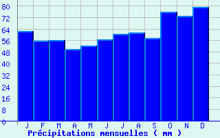 | Jan | Fev | Mars | Avr | Mai | Juin | Juil | Aout | Sept | Oct | Nov | Dec | Année | | Temp. max. (°C) | 5.8 | 7.2 | 11 | 13.9 | 18.2 | 20.8 | 23.3 | 23.9 | 19.6 | 14.7 | 9.3 | 5.7 | 14.5 | | Temp. moy. (°C) | 3.5 | 4.3 | 7.2 | 9.3 | 13.2 | 15.7 | 18 | 18.4 | 14.9 | 11 | 6.5 | 3.5 | 10.5 | | Temp. min. (°C) | 1.1 | 1.3 | 3.5 | 4.7 | 8.2 | 10.5 | 12.7 | 12.8 | 10.3 | 7.2 | 3.8 | 1.3 | 6.5 | | Jan | Fev | Mars | Avr | Mai | Juin | Juil | Aout | Sept | Oct | Nov | Dec | Année | | Jours Tx > 30°C | 0 | 0 | 0 | 0 | 0.1 | 0.5 | 2.1 | 3 | 0.1 | 0 | 0 | 0 | 5.7 | | Jours Tx > 25°C | 0 | 0 | 0 | 0.1 | 3 | 5.1 | 10.4 | 10.9 | 2.6 | 0.1 | 0 | 0 | 32.1 | | Jours Tx < 0°C | 2.6 | 1.3 | 0.1 | 0 | 0 | 0 | 0 | 0 | 0 | 0 | 0.6 | 3.3 | 8 | | Jours Tn < 0°C | 11.8 | 10.7 | 5.3 | 2.7 | 0.1 | 0 | 0 | 0 | 0 | 1.2 | 5.6 | 12.3 | 49.7 | | Jours Tn < -5°C | 2.5 | 1.6 | 0.1 | 0 | 0 | 0 | 0 | 0 | 0 | 0 | 0.5 | 2.1 | 6.9 | | Jours Tn < -10°C | 0.4 | 0.1 | 0 | 0 | 0 | 0 | 0 | 0 | 0 | 0 | 0 | 0.1 | 0.6 | | | | Jan | Fev | Mars | Avr | Mai | Juin | Juil | Aout | Sept | Oct | Nov | Dec | Année | | RR mensuel (mm) | 62.3 | 55.5 | 56 | 50 | 52.3 | 56.8 | 60.5 | 61.6 | 57.4 | 76.1 | 72.9 | 79.5 | 740.9 | | Jan | Fev | Mars | Avr | Mai | Juin | Juil | Aout | Sept | Oct | Nov | Dec | Année | | Jours RR > 1mm | 11.3 | 10.4 | 11.1 | 10.5 | 9.1 | 9.6 | 9.7 | 9.2 | 9.6 | 11.3 | 12 | 11.7 | 125.5 | | Jours RR > 5mm | 4.4 | 3.8 | 3.3 | 3.9 | 3.6 | 4 | 4.4 | 4.1 | 4.1 | 5.1 | 5.2 | 5.7 | 51.7 | | Jours RR > 10mm | 1.5 | 1.5 | 1.1 | 0.8 | 1.5 | 1.6 | 1.7 | 1.6 | 1.3 | 2.4 | 2.3 | 2.6 | 19.8 | | | | Jan | Fev | Mars | Avr | Mai | Juin | Juil | Aout | Sept | Oct | Nov | Dec | Année | | Vent moyen (km/h) | 19.8 | 19.1 | 18 | -- | -- | 13.7 | 14 | 13.7 | 15.1 | 17.3 | 17.3 | 18.4 | -- | | Jan | Fev | Mars | Avr | Mai | Juin | Juil | Aout | Sept | Oct | Nov | Dec | Année | | Jours rafales >= 58km/h | 9 | 7.9 | 6.7 | 5.5 | -- | 2 | 2.7 | 2.8 | 3.3 | -- | 5.7 | -- | -- | | Jours rafales >= 100km/h | 0.5 | 0.5 | 0.1 | 0.2 | -- | 0 | 0 | 0.1 | 0.1 | -- | 0.2 | -- | -- |
