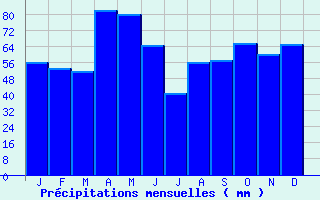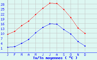 | Jan | Fev | Mars | Avr | Mai | Juin | Juil | Aout | Sept | Oct | Nov | Dec | Année | | Temp. max. (°C) | 9.4 | 11.2 | 14.7 | 17.4 | 21.6 | 25.5 | 28.7 | 28.4 | 24.7 | 19.7 | 13.2 | 9.8 | 18.7 | | Temp. moy. (°C) | 5.4 | 6.4 | 9.3 | 11.8 | 15.9 | 19.6 | 22.3 | 22 | 18.5 | 14.6 | 9 | 5.9 | 13.4 | | Temp. min. (°C) | 1.4 | 1.7 | 3.8 | 6.2 | 10.2 | 13.6 | 15.8 | 15.6 | 12.3 | 9.5 | 4.9 | 2.1 | 8.1 | | Jan | Fev | Mars | Avr | Mai | Juin | Juil | Aout | Sept | Oct | Nov | Dec | Année | | Jours Tx > 30°C | 0 | 0 | 0 | 0 | 0.9 | 6.4 | 13 | 11.8 | 3.5 | 0.1 | 0 | 0 | 35.6 | | Jours Tx > 25°C | 0 | 0 | 0.3 | 1.5 | 8.2 | 16.3 | 23.9 | 23.4 | 14.6 | 3.8 | 0 | 0 | 91.9 | | Jours Tx < 0°C | 1.1 | 0.2 | 0 | 0 | 0 | 0 | 0 | 0 | 0 | 0 | 0.1 | 0.7 | 2.1 | | Jours Tn < 0°C | 11.7 | 9.6 | 5.7 | 1.1 | 0 | 0 | 0 | 0 | 0 | 0.5 | 4.2 | 10.3 | 43.2 | | Jours Tn < -5°C | 2.1 | 1.7 | 0.4 | 0 | 0 | 0 | 0 | 0 | 0 | 0 | 0.5 | 1.8 | 6.5 | | Jours Tn < -10°C | 0.4 | 0.1 | 0 | 0 | 0 | 0 | 0 | 0 | 0 | 0 | 0 | 0.1 | 0.6 | | | | Jan | Fev | Mars | Avr | Mai | Juin | Juil | Aout | Sept | Oct | Nov | Dec | Année | | RR mensuel (mm) | 55.9 | 53.1 | 51.5 | 82 | 79.9 | 64.4 | 40.6 | 55.9 | 57.1 | 65.4 | 60 | 65.1 | 730.9 | | Jan | Fev | Mars | Avr | Mai | Juin | Juil | Aout | Sept | Oct | Nov | Dec | Année | | Jours RR > 1mm | 10.2 | 8.4 | 8.8 | 10.2 | 9.6 | 7.3 | 5.1 | 6.5 | 6.7 | 9.1 | 9.7 | 10 | 101.7 | | Jours RR > 5mm | 4 | 3.7 | 3.5 | 5.4 | 5.1 | 3.8 | 2.5 | 3.1 | 3.3 | 4.2 | 4.2 | 4.4 | 47.2 | | Jours RR > 10mm | 1.3 | 1.5 | 1.4 | 2.6 | 2.7 | 1.6 | 1.3 | 1.8 | 1.8 | 1.7 | 1.7 | 1.9 | 21.2 | | | | Jan | Fev | Mars | Avr | Mai | Juin | Juil | Aout | Sept | Oct | Nov | Dec | Année | | Vent moyen (km/h) | 7.9 | 9 | 9.7 | 10.1 | 9.4 | 9 | 9.4 | 8.3 | 7.9 | 8.3 | 8.3 | 7.9 | 8.6 | | Jan | Fev | Mars | Avr | Mai | Juin | Juil | Aout | Sept | Oct | Nov | Dec | Année | | Jours rafales >= 58km/h | 2.1 | 2.7 | 2.8 | 3.6 | 1.4 | 1.2 | 1.5 | 1.6 | 1.2 | 2.3 | 2.3 | 2.1 | 24.7 | | Jours rafales >= 100km/h | 0.1 | 0 | 0 | 0.1 | 0.1 | 0.1 | 0.1 | 0 | 0.1 | 0 | 0 | 0.1 | 0.5 | | | | Jan | Fev | Mars | Avr | Mai | Juin | Juil | Aout | Sept | Oct | Nov | Dec | Année | | Ensoleillement (heures) | 96.6 | 118.6 | 177 | 183.6 | 219.3 | 244.9 | 270.6 | 255.7 | 213.5 | 154.1 | 92.7 | 86.8 | 2113.2 |
