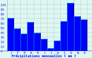 | Jan | Fev | Mars | Avr | Mai | Juin | Juil | Aout | Sept | Oct | Nov | Dec | Année | | Temp. max. (°C) | 12.9 | 13.5 | 16 | 18.3 | 22.3 | 26.4 | 29.6 | 29.7 | 25.9 | 21.3 | 16.4 | 13.5 | 20.5 | | Temp. moy. (°C) | 9.6 | 9.9 | 12.1 | 14.2 | 18 | 21.7 | 24.7 | 24.7 | 21.4 | 17.7 | 13.1 | 10.3 | 16.5 | | Temp. min. (°C) | 6.2 | 6.3 | 8.2 | 10.1 | 13.6 | 17 | 19.7 | 19.8 | 16.9 | 14.1 | 9.8 | 7.2 | 12.4 | | Jan | Fev | Mars | Avr | Mai | Juin | Juil | Aout | Sept | Oct | Nov | Dec | Année | | Jours Tx > 30°C | 0 | 0 | 0 | 0 | 0.2 | 3.8 | 14.4 | 15 | 2.9 | 0 | 0 | 0 | 36.3 | | Jours Tx > 25°C | 0 | 0 | 0.1 | 0.4 | 6.5 | 20.1 | 29 | 29.6 | 19.3 | 3.2 | 0 | 0 | 108.1 | | Jours Tx < 0°C | 0 | 0 | 0 | 0 | 0 | 0 | 0 | 0 | 0 | 0 | 0 | 0 | 0 | | Jours Tn < 0°C | 0.8 | 0.6 | 0 | 0 | 0 | 0 | 0 | 0 | 0 | 0 | 0.1 | 0.3 | 1.9 | | Jours Tn < -5°C | 0.1 | 0 | 0 | 0 | 0 | 0 | 0 | 0 | 0 | 0 | 0 | 0 | 0.1 | | Jours Tn < -10°C | 0 | 0 | 0 | 0 | 0 | 0 | 0 | 0 | 0 | 0 | 0 | 0 | 0 | | | | Jan | Fev | Mars | Avr | Mai | Juin | Juil | Aout | Sept | Oct | Nov | Dec | Année | | RR mensuel (mm) | 70.6 | 47.6 | 36.6 | 61.5 | 38.7 | 25.1 | 5.6 | 21.7 | 63.6 | 103.2 | 74.4 | 67.5 | 616.1 | | Jan | Fev | Mars | Avr | Mai | Juin | Juil | Aout | Sept | Oct | Nov | Dec | Année | | Jours RR > 1mm | 6.2 | 5.1 | 4.6 | 6.5 | 4.5 | 2.9 | 1 | 2 | 4.6 | 6.6 | 6.8 | 7 | 57.7 | | Jours RR > 5mm | 3.3 | 2.6 | 2.2 | 3.3 | 2.3 | 1.4 | 0.4 | 1.1 | 2.5 | 4.5 | 4.1 | 3.7 | 31.4 | | Jours RR > 10mm | 2 | 1.5 | 1.2 | 2 | 1.3 | 0.8 | 0.1 | 0.6 | 1.8 | 3.1 | 2.5 | 1.9 | 18.7 | | | | Jan | Fev | Mars | Avr | Mai | Juin | Juil | Aout | Sept | Oct | Nov | Dec | Année | | Vent moyen (km/h) | 16.2 | 17.3 | 17.3 | 18 | 16.2 | 15.1 | 15.1 | 14 | 15.1 | 16.6 | 16.2 | 15.8 | 16.2 | | Jan | Fev | Mars | Avr | Mai | Juin | Juil | Aout | Sept | Oct | Nov | Dec | Année | | Jours rafales >= 58km/h | 11.1 | 10.5 | 11.5 | 11.7 | 8.6 | 8.5 | 8.6 | 7.7 | 8 | 10 | 10.1 | 10.3 | 116.5 | | Jours rafales >= 100km/h | 1.5 | 1.1 | 0.7 | 0.5 | 0.3 | 0.2 | 0.1 | 0.1 | 0.3 | 0.5 | 1 | 1.3 | 7.7 | | | | Jan | Fev | Mars | Avr | Mai | Juin | Juil | Aout | Sept | Oct | Nov | Dec | Année | | Jours avec brouillard (*) | 0 | 0.1 | 0.4 | 0.4 | -- | 0.3 | 0.3 | 0.5 | 0.1 | 0.2 | 0 | 0 | -- | | Jours avec orage (*) | 1 | 0.9 | 0.9 | 1.2 | -- | 2.3 | 2 | 2.7 | 3.6 | 3.6 | 2.2 | 1.1 | -- | | Jours avec grêle (*) | 0.2 | 0.1 | 0 | 0.1 | -- | 0 | 0 | 0 | 0.1 | 0 | 0.1 | 0.1 | -- | | Jours avec neige (*) | 0.5 | 0.2 | 0 | 0 | -- | 0 | 0 | 0 | 0 | 0 | 0.1 | 0.2 | -- | | | | Jan | Fev | Mars | Avr | Mai | Juin | Juil | Aout | Sept | Oct | Nov | Dec | Année | | Ensoleillement (heures) | 146.7 | 173.8 | 233.5 | 245.8 | 288.3 | 331.6 | 369.2 | 332.7 | 259.3 | 182.4 | 146.5 | 129.1 | 2838.8 |