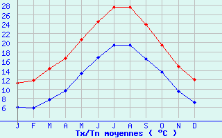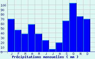 | Jan | Fev | Mars | Avr | Mai | Juin | Juil | Aout | Sept | Oct | Nov | Dec | Année | | Temp. max. (°C) | 11.3 | 11.9 | 14.4 | 16.6 | 20.6 | 24.5 | 27.6 | 27.7 | 23.9 | 19.5 | 14.8 | 12 | 18.8 | | Temp. moy. (°C) | 8.7 | 8.9 | 11.1 | 13.2 | 17 | 20.6 | 23.5 | 23.6 | 20.2 | 16.6 | 12.2 | 9.6 | 15.5 | | Temp. min. (°C) | 6.1 | 5.9 | 7.7 | 9.7 | 13.4 | 16.7 | 19.4 | 19.5 | 16.5 | 13.6 | 9.5 | 7.1 | 12.1 | | Jan | Fev | Mars | Avr | Mai | Juin | Juil | Aout | Sept | Oct | Nov | Dec | Année | | Jours Tx > 30°C | 0 | 0 | 0 | 0 | 0 | 1.2 | 5.4 | 5 | 0 | 0 | 0 | 0 | 11.7 | | Jours Tx > 25°C | 0 | 0 | 0 | 0 | 2.2 | 12.9 | 27 | 27 | 10.9 | 0.4 | 0 | 0 | 80.5 | | Jours Tx < 0°C | 0.1 | 0.1 | 0 | 0 | 0 | 0 | 0 | 0 | 0 | 0 | 0 | 0 | 0.1 | | Jours Tn < 0°C | 1 | 0.9 | 0 | 0 | 0 | 0 | 0 | 0 | 0 | 0 | 0.1 | 0.4 | 2.4 | | Jours Tn < -5°C | 0.1 | 0 | 0 | 0 | 0 | 0 | 0 | 0 | 0 | 0 | 0 | 0 | 0.2 | | Jours Tn < -10°C | 0 | 0 | 0 | 0 | 0 | 0 | 0 | 0 | 0 | 0 | 0 | 0 | 0 | | | | Jan | Fev | Mars | Avr | Mai | Juin | Juil | Aout | Sept | Oct | Nov | Dec | Année | | RR mensuel (mm) | 69.4 | 46.2 | 38.2 | 58.5 | 38.1 | 24 | 5.6 | 19.4 | 65.5 | 103.9 | 75.3 | 69.3 | 613.4 | | Jan | Fev | Mars | Avr | Mai | Juin | Juil | Aout | Sept | Oct | Nov | Dec | Année | | Jours RR > 1mm | 6 | 5 | 4.6 | 6.3 | 4.3 | 3 | 1 | 1.9 | 4.5 | 6.6 | 7.1 | 7 | 57.2 | | Jours RR > 5mm | 3.4 | 2.5 | 2.2 | 3.3 | 2.2 | 1.3 | 0.3 | 1.1 | 2.4 | 4.4 | 3.9 | 3.3 | 30.3 | | Jours RR > 10mm | 2 | 1.2 | 1.3 | 1.9 | 1.2 | 0.7 | 0.1 | 0.6 | 1.8 | 3.1 | 2.6 | 1.8 | 18.4 | | | | Jan | Fev | Mars | Avr | Mai | Juin | Juil | Aout | Sept | Oct | Nov | Dec | Année | | Vent moyen (km/h) | 24.1 | 25.2 | 24.8 | 24.1 | 21.2 | 20.9 | 20.9 | 19.8 | 21.2 | 23.4 | 23.8 | 23.8 | 22.7 | | | | Jan | Fev | Mars | Avr | Mai | Juin | Juil | Aout | Sept | Oct | Nov | Dec | Année | | Jours avec brouillard (*) | -- | -- | 1.6 | 1.2 | 1.8 | 1.6 | 1.2 | -- | 0.9 | 0.8 | 0.4 | -- | -- | | Jours avec orage (*) | 1 | -- | 0.6 | 1.2 | 1.7 | 1.8 | 1.5 | -- | 3.3 | 3.2 | 2 | -- | -- | | Jours avec grêle (*) | -- | -- | 0.1 | 0.2 | 0.1 | 0.1 | 0 | -- | 0.1 | 0.1 | 0.3 | -- | -- |