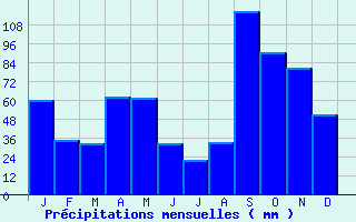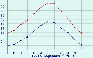 | Jan | Fev | Mars | Avr | Mai | Juin | Juil | Aout | Sept | Oct | Nov | Dec | Année | | Temp. max. (°C) | 10.3 | 12.3 | 16.3 | 19.3 | 24 | 28.4 | 31.2 | 30.7 | 25.2 | 20.7 | 14.1 | 10.3 | 20.3 | | Temp. moy. (°C) | 6 | 7.4 | 10.7 | 13.5 | 18 | 22.1 | 24.7 | 24.2 | 19.5 | 15.7 | 10 | 6.3 | 14.9 | | Temp. min. (°C) | 1.8 | 2.5 | 5.1 | 7.8 | 12 | 15.7 | 18.1 | 17.8 | 13.8 | 10.7 | 5.8 | 2.4 | 9.5 | | Jan | Fev | Mars | Avr | Mai | Juin | Juil | Aout | Sept | Oct | Nov | Dec | Année | | Jours Tx > 30°C | 0 | 0 | 0 | 0.1 | 1.9 | 11.1 | 21.3 | 18.4 | 2.9 | 0 | 0 | 0 | 55.6 | | Jours Tx > 25°C | 0 | 0 | 0.2 | 2.5 | 12.7 | 23.8 | 29.6 | 28.8 | 16.3 | 3.8 | 0 | 0 | 117.5 | | Jours Tx < 0°C | 0.2 | 0.1 | 0 | 0 | 0 | 0 | 0 | 0 | 0 | 0 | 0 | 0.2 | 0.5 | | Jours Tn < 0°C | 11.4 | 8.5 | 3.1 | 0.1 | 0 | 0 | 0 | 0 | 0 | 0.2 | 2.8 | 9.7 | 35.7 | | Jours Tn < -5°C | 1.1 | 0.5 | 0.1 | 0 | 0 | 0 | 0 | 0 | 0 | 0 | 0.3 | 1.2 | 3.2 | | Jours Tn < -10°C | 0 | 0 | 0 | 0 | 0 | 0 | 0 | 0 | 0 | 0 | 0 | 0 | 0 | | | | Jan | Fev | Mars | Avr | Mai | Juin | Juil | Aout | Sept | Oct | Nov | Dec | Année | | RR mensuel (mm) | 59.7 | 34.5 | 32.6 | 62.1 | 61.1 | 32 | 21.9 | 32.7 | 117.2 | 90.8 | 80.9 | 51.1 | 676.6 | | Jan | Fev | Mars | Avr | Mai | Juin | Juil | Aout | Sept | Oct | Nov | Dec | Année | | Jours RR > 1mm | 6.1 | 4.5 | 3.8 | 6.5 | 6.4 | 3.5 | 2.5 | 3.5 | 6 | 6.2 | 7.5 | 5.5 | 61.9 | | Jours RR > 5mm | 2.9 | 1.9 | 1.7 | 3.8 | 3.5 | 1.5 | 1.2 | 1.9 | 4.2 | 4 | 4.1 | 2.3 | 32.9 | | Jours RR > 10mm | 1.9 | 0.9 | 1.1 | 2.1 | 2.2 | 1.1 | 0.7 | 1.2 | 3 | 2.9 | 2.4 | 1.4 | 21 | | | | Jan | Fev | Mars | Avr | Mai | Juin | Juil | Aout | Sept | Oct | Nov | Dec | Année | | Vent moyen (km/h) | 13 | 14.4 | 14.4 | -- | 11.9 | -- | -- | 12.6 | 11.9 | 11.9 | 14 | 14 | -- | | Jan | Fev | Mars | Avr | Mai | Juin | Juil | Aout | Sept | Oct | Nov | Dec | Année | | Jours rafales >= 58km/h | -- | -- | 9.9 | -- | -- | -- | 7.3 | 6.9 | -- | 8.3 | 11.4 | 11.1 | -- | | Jours rafales >= 100km/h | -- | -- | 0.8 | -- | -- | -- | 0 | 0.2 | -- | 0.1 | 0.4 | 0.9 | -- |