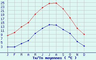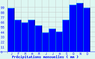 | Jan | Fev | Mars | Avr | Mai | Juin | Juil | Aout | Sept | Oct | Nov | Dec | Année | | Temp. max. (°C) | 8.4 | 9.8 | 12.7 | 14.9 | 19.1 | 22.4 | 24.5 | 24.7 | 21.8 | 17.3 | 12 | 8.9 | 16.4 | | Temp. moy. (°C) | 5.5 | 6.2 | 8.5 | 10.4 | 14.2 | 17.2 | 19.1 | 19.2 | 16.5 | 13.4 | 8.7 | 6 | 12.1 | | Temp. min. (°C) | 2.6 | 2.6 | 4.3 | 5.8 | 9.4 | 12 | 13.8 | 13.7 | 11.3 | 9.4 | 5.4 | 3.1 | 7.8 | | Jan | Fev | Mars | Avr | Mai | Juin | Juil | Aout | Sept | Oct | Nov | Dec | Année | | Jours Tx > 30°C | 0 | 0 | 0 | 0 | 0.1 | 1.9 | 3.4 | 3.6 | 0.8 | 0 | 0 | 0 | 9.7 | | Jours Tx > 25°C | 0 | 0 | 0 | 0.2 | 3.4 | 7.9 | 12.5 | 13.2 | 5.6 | 0.6 | 0 | 0 | 43.3 | | Jours Tx < 0°C | 1.5 | 0.5 | 0 | 0 | 0 | 0 | 0 | 0 | 0 | 0 | 0 | 0.7 | 2.8 | | Jours Tn < 0°C | 9.4 | 8.5 | 4.9 | 1.4 | 0 | 0 | 0 | 0 | 0 | 0.4 | 3.9 | 8.6 | 37.1 | | Jours Tn < -5°C | 2 | 1.5 | 0.2 | 0 | 0 | 0 | 0 | 0 | 0 | 0 | 0.4 | 1 | 5.1 | | Jours Tn < -10°C | 0.5 | 0.1 | 0 | 0 | 0 | 0 | 0 | 0 | 0 | 0 | 0 | 0 | 0.7 | | | | Jan | Fev | Mars | Avr | Mai | Juin | Juil | Aout | Sept | Oct | Nov | Dec | Année | | RR mensuel (mm) | 96.8 | 70.9 | 65 | 70.7 | 58.2 | 42.6 | 51.2 | 44.5 | 70.6 | 104.1 | 108.6 | 97.5 | 880.7 | | Jan | Fev | Mars | Avr | Mai | Juin | Juil | Aout | Sept | Oct | Nov | Dec | Année | | Jours RR > 1mm | 12.1 | 10.1 | 10.4 | 11.1 | 9.2 | 7.3 | 7.1 | 7 | 8 | 12.1 | 13.3 | 12.6 | 120.3 | | Jours RR > 5mm | 6.4 | 4.9 | 4.4 | 5 | 3.9 | 2.9 | 3 | 2.6 | 4.1 | 6.6 | 7.4 | 6.6 | 57.9 | | Jours RR > 10mm | 3.2 | 2.5 | 1.8 | 2.4 | 1.5 | 1 | 1.5 | 1.4 | 2.3 | 3.4 | 3.6 | 3.4 | 28 | | | | Jan | Fev | Mars | Avr | Mai | Juin | Juil | Aout | Sept | Oct | Nov | Dec | Année | | Vent moyen (km/h) | 15.5 | 15.5 | 15.1 | 15.1 | 13.7 | 13.3 | 13 | 12.2 | 12.6 | 13.3 | 13.3 | 14.8 | 14 | | Jan | Fev | Mars | Avr | Mai | Juin | Juil | Aout | Sept | Oct | Nov | Dec | Année | | Jours rafales >= 58km/h | 6.8 | 6.2 | 5.7 | 4.4 | 2.3 | 1.9 | 1.8 | 1.5 | 1.9 | 4.4 | 4.9 | 5.9 | 47.7 | | Jours rafales >= 100km/h | 0.5 | 0.4 | 0 | 0.1 | 0 | 0 | 0 | 0 | 0 | 0.1 | 0.2 | 0.3 | 1.6 | | | | Jan | Fev | Mars | Avr | Mai | Juin | Juil | Aout | Sept | Oct | Nov | Dec | Année | | Jours avec brouillard (*) | 7 | 5.4 | 4.3 | 3.9 | 3.4 | 2.4 | 2.4 | 3.3 | 4.6 | 5.2 | 6.4 | 8.2 | 56.4 | | Jours avec orage (*) | 0.4 | 0.4 | 0.3 | 0.9 | 1.6 | 2 | 2.1 | 2.2 | 1.2 | 1.2 | 0.6 | 0.4 | 13.1 | | Jours avec grêle (*) | 0.5 | 0.4 | 0.5 | 0.5 | 0.1 | 0.1 | 0 | 0.1 | 0 | 0 | 0.1 | 0 | 2.5 | | Jours avec neige (*) | 1.4 | 1.8 | 0.6 | 0.1 | 0 | 0 | 0 | 0 | 0 | 0 | 0.2 | 0.8 | 4.9 | | | | Jan | Fev | Mars | Avr | Mai | Juin | Juil | Aout | Sept | Oct | Nov | Dec | Année | | Ensoleillement (heures) | 72.4 | 102.8 | 145.4 | 171.1 | 198.8 | 230.6 | 232.3 | 229.7 | 194.2 | 124.1 | 81.2 | 69.4 | 1852 |