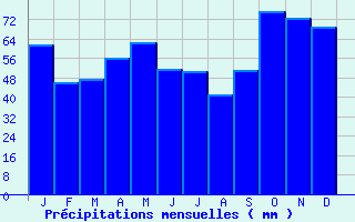 | Jan | Fev | Mars | Avr | Mai | Juin | Juil | Aout | Sept | Oct | Nov | Dec | Année | | Temp. max. (°C) | 7.8 | 9.3 | 12.9 | 15.5 | 19.5 | 23.2 | 25.8 | 25.7 | 22.2 | 17.4 | 11.5 | 8.2 | 16.6 | | Temp. moy. (°C) | 4.7 | 5.3 | 8 | 10.2 | 14 | 17.3 | 19.6 | 19.4 | 16.3 | 12.8 | 7.8 | 5.1 | 11.7 | | Temp. min. (°C) | 1.5 | 1.3 | 3.1 | 4.9 | 8.6 | 11.5 | 13.4 | 13.1 | 10.4 | 8.2 | 4 | 2 | 6.9 | | Jan | Fev | Mars | Avr | Mai | Juin | Juil | Aout | Sept | Oct | Nov | Dec | Année | | Jours Tx > 30°C | 0 | 0 | 0 | 0 | 0.2 | 2.3 | 5.2 | 5.1 | 1 | 0 | 0 | 0 | 13.8 | | Jours Tx > 25°C | 0 | 0 | 0 | 0.6 | 4.1 | 9.6 | 16.6 | 16 | 6.8 | 1.1 | 0 | 0 | 54.8 | | Jours Tx < 0°C | 2 | 0.8 | 0 | 0 | 0 | 0 | 0 | 0 | 0 | 0 | 0.2 | 1 | 4 | | Jours Tn < 0°C | 11.9 | 12.1 | 8.2 | 2.5 | 0.1 | 0 | 0 | 0 | 0 | 1.2 | 6.3 | 11.1 | 53.3 | | Jours Tn < -5°C | 3 | 2.4 | 0.7 | 0.1 | 0 | 0 | 0 | 0 | 0 | 0.1 | 1.1 | 2 | 9.3 | | Jours Tn < -10°C | 0.7 | 0.2 | 0 | 0 | 0 | 0 | 0 | 0 | 0 | 0 | 0.1 | 0.2 | 1.1 | | | | Jan | Fev | Mars | Avr | Mai | Juin | Juil | Aout | Sept | Oct | Nov | Dec | Année | | RR mensuel (mm) | 61.8 | 46.2 | 47.4 | 56.1 | 62.6 | 51.5 | 50.5 | 41.2 | 51.1 | 75.6 | 72.8 | 68.8 | 685.6 | | Jan | Fev | Mars | Avr | Mai | Juin | Juil | Aout | Sept | Oct | Nov | Dec | Année | | Jours RR > 1mm | 10.5 | 8.9 | 8.9 | 10.1 | 10.7 | 7.6 | 7.1 | 6.2 | 6.9 | 10.5 | 11.2 | 10.7 | 109.3 | | Jours RR > 5mm | 4.3 | 2.9 | 3.1 | 3.9 | 4.4 | 3.3 | 3.1 | 2.9 | 3.4 | 4.8 | 4.9 | 5 | 45.9 | | Jours RR > 10mm | 1.6 | 1.3 | 1.2 | 1.5 | 1.5 | 1.3 | 1.8 | 1.3 | 1.8 | 2.3 | 2.1 | 2 | 19.7 | | | | Jan | Fev | Mars | Avr | Mai | Juin | Juil | Aout | Sept | Oct | Nov | Dec | Année | | Vent moyen (km/h) | 15.1 | 14.4 | 14.4 | 14.4 | 12.6 | 12.2 | 12.6 | 11.5 | 11.5 | 12.6 | 13.3 | 14.4 | 13.3 | | Jan | Fev | Mars | Avr | Mai | Juin | Juil | Aout | Sept | Oct | Nov | Dec | Année | | Jours rafales >= 58km/h | 5.5 | 4.6 | 5.1 | 4 | 2.8 | 2.3 | 2.2 | 1.3 | 2 | 3.5 | 3.5 | 4.8 | 41.6 | | Jours rafales >= 100km/h | 0.2 | 0.1 | 0 | 0 | 0 | 0 | 0.1 | 0.1 | 0 | 0 | 0.1 | 0.1 | 0.7 | | | | Jan | Fev | Mars | Avr | Mai | Juin | Juil | Aout | Sept | Oct | Nov | Dec | Année | | Ensoleillement (heures) | 69.7 | 96.1 | 153.8 | 174.6 | 206.5 | 232.9 | 242.7 | 241.8 | 194.2 | 128.8 | 82.6 | 65.2 | 1888.8 |