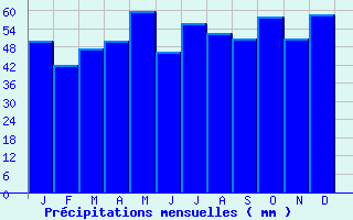 | Jan | Fev | Mars | Avr | Mai | Juin | Juil | Aout | Sept | Oct | Nov | Dec | Année | | Temp. max. (°C) | 6.7 | 7.9 | 11.9 | 15.2 | 19.2 | 22.7 | 25.5 | 25.2 | 21.3 | 16.3 | 10.5 | 7 | 15.8 | | Temp. moy. (°C) | 3.9 | 4.5 | 7.6 | 10.2 | 14.1 | 17.3 | 19.7 | 19.4 | 16 | 12.1 | 7.2 | 4.5 | 11.4 | | Temp. min. (°C) | 1.2 | 1.1 | 3.3 | 5.3 | 9 | 11.9 | 13.8 | 13.6 | 10.7 | 7.8 | 4 | 1.9 | 7 | | Jan | Fev | Mars | Avr | Mai | Juin | Juil | Aout | Sept | Oct | Nov | Dec | Année | | Jours Tx > 30°C | 0 | 0 | 0 | 0 | 0 | 1.7 | 5 | 4 | 0.7 | 0 | 0 | 0 | 11.5 | | Jours Tx > 25°C | 0 | 0 | 0 | 0.5 | 3.5 | 9.1 | 16.5 | 14.4 | 4.6 | 0.6 | 0 | 0 | 49.3 | | Jours Tx < 0°C | 2.4 | 1.4 | 0 | 0 | 0 | 0 | 0 | 0 | 0 | 0 | 0.3 | 1.1 | 5.2 | | Jours Tn < 0°C | 12 | 12.2 | 6.7 | 2.1 | 0 | 0 | 0 | 0 | 0 | 1.2 | 5.9 | 11 | 51.1 | | Jours Tn < -5°C | 2.9 | 2 | 0.2 | 0 | 0 | 0 | 0 | 0 | 0 | 0 | 0.7 | 1.5 | 7.3 | | Jours Tn < -10°C | 0.7 | 0.1 | 0 | 0 | 0 | 0 | 0 | 0 | 0 | 0 | 0 | 0 | 0.9 | | | | Jan | Fev | Mars | Avr | Mai | Juin | Juil | Aout | Sept | Oct | Nov | Dec | Année | | RR mensuel (mm) | 49.8 | 42 | 47.5 | 49.8 | 59.9 | 46.2 | 55.8 | 52.5 | 50.5 | 57.8 | 50.7 | 58.7 | 621.2 | | Jan | Fev | Mars | Avr | Mai | Juin | Juil | Aout | Sept | Oct | Nov | Dec | Année | | Jours RR > 1mm | 10.4 | 9.5 | 10 | 9.1 | 10 | 8.2 | 7.9 | 7.2 | 7.8 | 9.4 | 10.5 | 11.1 | 111.1 | | Jours RR > 5mm | 3.4 | 2.8 | 3.5 | 3.3 | 4.3 | 3.4 | 3.2 | 3.1 | 3.4 | 3.8 | 3.4 | 4 | 41.6 | | Jours RR > 10mm | 0.9 | 0.7 | 0.6 | 1.3 | 1.6 | 1.1 | 1.9 | 1.1 | 1.6 | 1.6 | 1.3 | 1.1 | 14.8 | | | | Jan | Fev | Mars | Avr | Mai | Juin | Juil | Aout | Sept | Oct | Nov | Dec | Année | | Vent moyen (km/h) | 17.3 | 15.8 | 15.8 | 14.8 | 13.7 | 13 | 12.6 | 11.9 | 13 | 14 | 14 | 15.8 | 14.4 | | Jan | Fev | Mars | Avr | Mai | Juin | Juil | Aout | Sept | Oct | Nov | Dec | Année | | Jours rafales >= 58km/h | 7.5 | 5.8 | 6.5 | 4.2 | 3 | 1.9 | 2.4 | 2.5 | 2.5 | 4.5 | 4 | 6 | 50.8 | | Jours rafales >= 100km/h | 0.3 | 0.2 | 0 | 0 | 0.1 | 0 | 0 | 0.1 | 0 | 0.1 | 0.2 | 0.3 | 1.4 | | | | Jan | Fev | Mars | Avr | Mai | Juin | Juil | Aout | Sept | Oct | Nov | Dec | Année | | Ensoleillement (heures) | 64.6 | 80.9 | 130.3 | 167.8 | 205 | 217.5 | 226.4 | 219.9 | 162.3 | 113.5 | 68 | 53.6 | 1709.7 |
