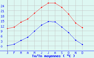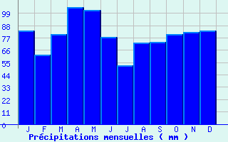 | Jan | Fev | Mars | Avr | Mai | Juin | Juil | Aout | Sept | Oct | Nov | Dec | Année | | Temp. max. (°C) | 10.3 | 11.3 | 14.2 | 16 | 19.5 | 22.9 | 25.5 | 25.6 | 23 | 19 | 13.7 | 10.9 | 17.7 | | Temp. moy. (°C) | 5.3 | 6.2 | 8.8 | 10.6 | 14.2 | 17.7 | 20 | 20 | 17.1 | 13.5 | 8.6 | 5.9 | 12.4 | | Temp. min. (°C) | 0.3 | 1.1 | 3.3 | 5.2 | 8.9 | 12.5 | 14.5 | 14.3 | 11.2 | 8 | 3.5 | 0.9 | 7 | | Jan | Fev | Mars | Avr | Mai | Juin | Juil | Aout | Sept | Oct | Nov | Dec | Année | | Jours Tx > 30°C | 0 | 0 | 0 | 0 | 0.2 | 1.8 | 5.8 | 5.6 | 1.7 | 0.1 | 0 | 0 | 15.2 | | Jours Tx > 25°C | 0 | 0.1 | 0.3 | 0.7 | 4.6 | 10.6 | 16.4 | 16.1 | 10.2 | 3.2 | 0.1 | 0 | 62.3 | | Jours Tx < 0°C | 0.8 | 0.6 | 0.1 | 0 | 0 | 0 | 0 | 0 | 0 | 0 | 0.1 | 0.3 | 1.9 | | Jours Tn < 0°C | 13.9 | 11.5 | 5.2 | 1.3 | 0 | 0 | 0 | 0 | 0 | 0.6 | 5.8 | 12.5 | 50.8 | | Jours Tn < -5°C | 2.4 | 1.4 | 0.4 | 0 | 0 | 0 | 0 | 0 | 0 | 0 | 0.5 | 1.9 | 6.8 | | Jours Tn < -10°C | 0.4 | 0.1 | 0 | 0 | 0 | 0 | 0 | 0 | 0 | 0 | 0 | 0.1 | 0.7 | | | | Jan | Fev | Mars | Avr | Mai | Juin | Juil | Aout | Sept | Oct | Nov | Dec | Année | | RR mensuel (mm) | 83.3 | 61.6 | 80.2 | 104.6 | 101.8 | 77.4 | 52.2 | 72.6 | 73 | 80.1 | 82 | 83.4 | 952.2 | | Jan | Fev | Mars | Avr | Mai | Juin | Juil | Aout | Sept | Oct | Nov | Dec | Année | | Jours RR > 1mm | 10.4 | 9.2 | 10.7 | 12 | 12.2 | 9.3 | 7.2 | 8.9 | 8.6 | 10.5 | 9.8 | 10 | 118.9 | | Jours RR > 5mm | 5.8 | 4.1 | 5.3 | 7.1 | 6.6 | 4.5 | 3.4 | 4.4 | 4.5 | 5.2 | 5.6 | 5.9 | 62.4 | | Jours RR > 10mm | 2.8 | 1.7 | 2.8 | 3.5 | 3.2 | 2.4 | 1.6 | 2.4 | 2.4 | 2.3 | 2.9 | 2.9 | 30.9 | | | | Jan | Fev | Mars | Avr | Mai | Juin | Juil | Aout | Sept | Oct | Nov | Dec | Année | | Vent moyen (km/h) | 7.9 | 8.6 | 9 | 9 | 7.6 | 7.2 | 7.2 | 6.8 | 6.5 | 6.8 | 7.2 | 7.6 | 7.6 | | Jan | Fev | Mars | Avr | Mai | Juin | Juil | Aout | Sept | Oct | Nov | Dec | Année | | Jours rafales >= 58km/h | 3.3 | 3.1 | 3.8 | 3.7 | 2.2 | 1.1 | 1.5 | 1.3 | 1 | 1.9 | 2.3 | 3 | 28.3 | | Jours rafales >= 100km/h | 0.1 | 0.1 | 0 | 0 | 0 | 0 | 0 | 0 | 0 | 0 | 0 | 0.1 | 0.4 | | | | Jan | Fev | Mars | Avr | Mai | Juin | Juil | Aout | Sept | Oct | Nov | Dec | Année | | Ensoleillement (heures) | 119.3 | 130.5 | 169.2 | 168.7 | 179.4 | 189.3 | 204.6 | 207.2 | 190.1 | 152.4 | 117.2 | 108.7 | 1936.3 |